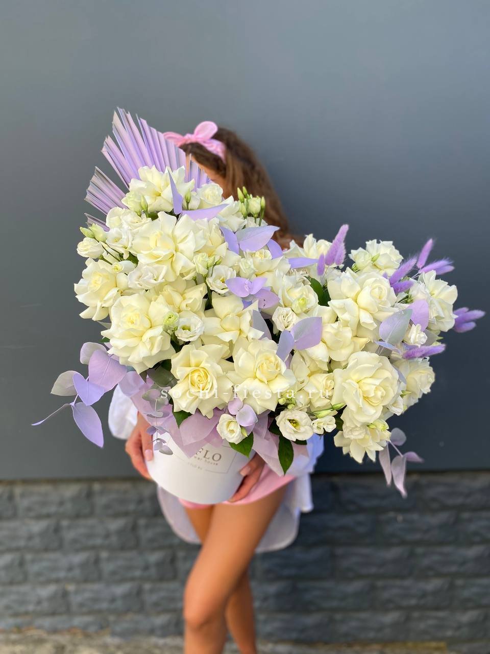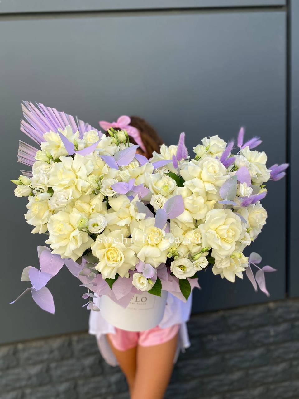 пионовидная роза сорта Мисти бабблс, эвкалипт в коробке или корзине.