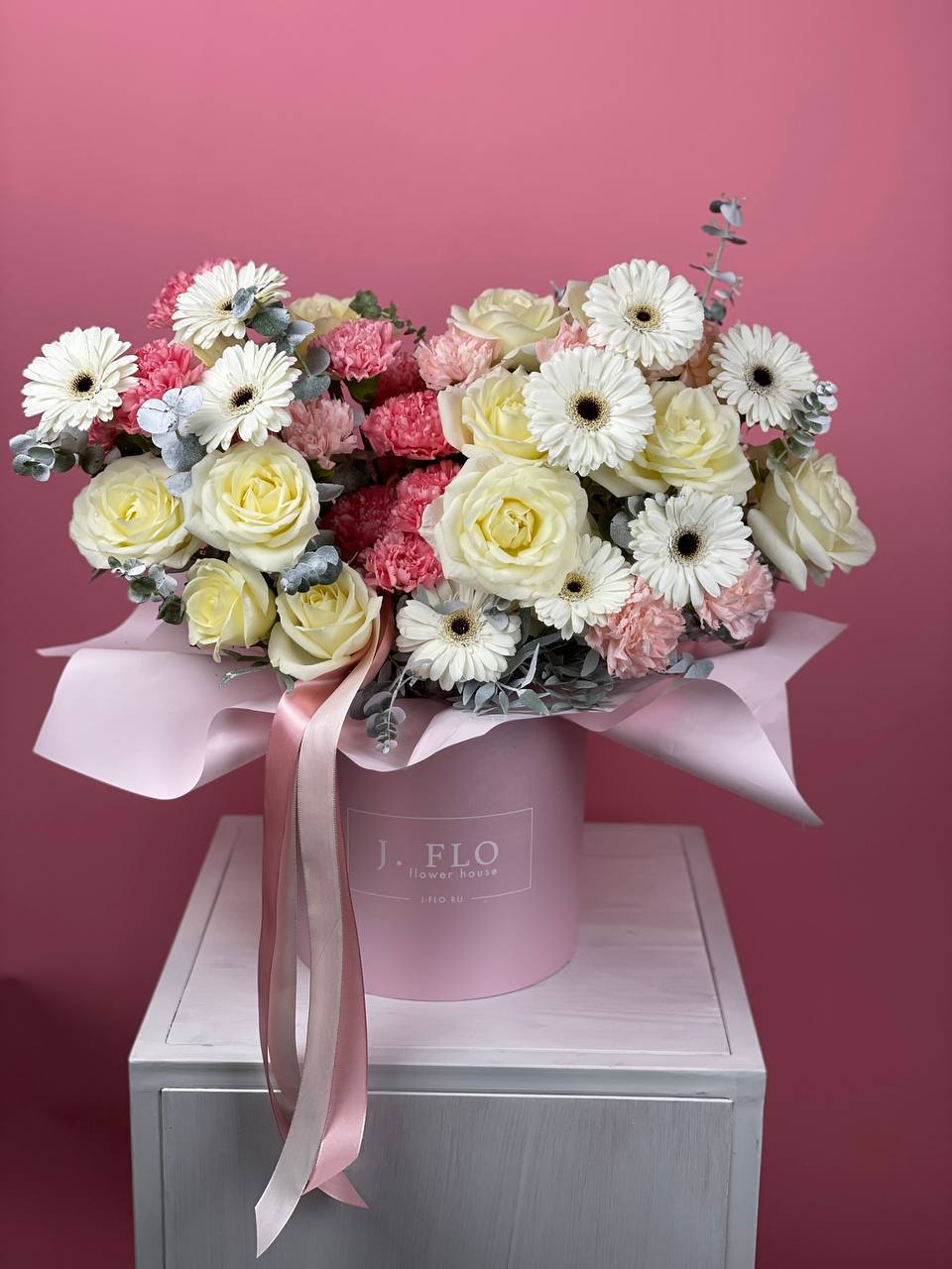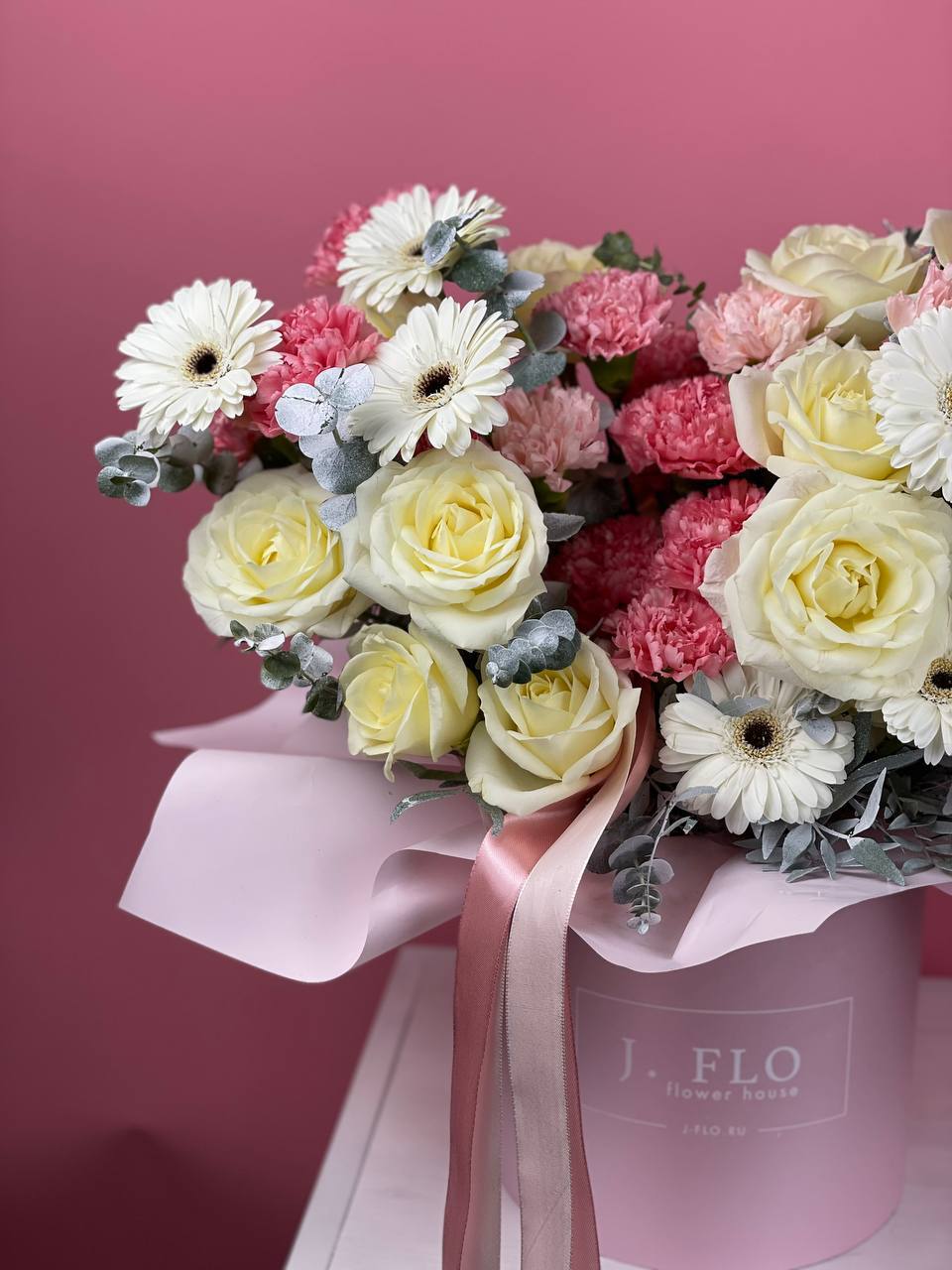 Пионы и гортензии наполняют композицию объемом и мягкой фактурой лепестков. Цилиндр собирает цветы в плотную форму, где каждый бутон находит свое место в общем движении.