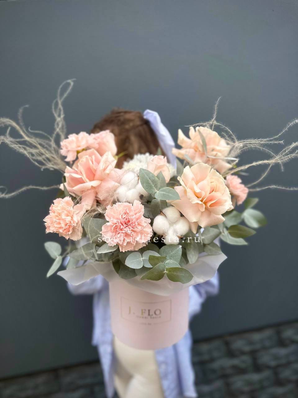 пионы, маттиола, эустома, белые розы, лента, гортензия, цилиндр D20.