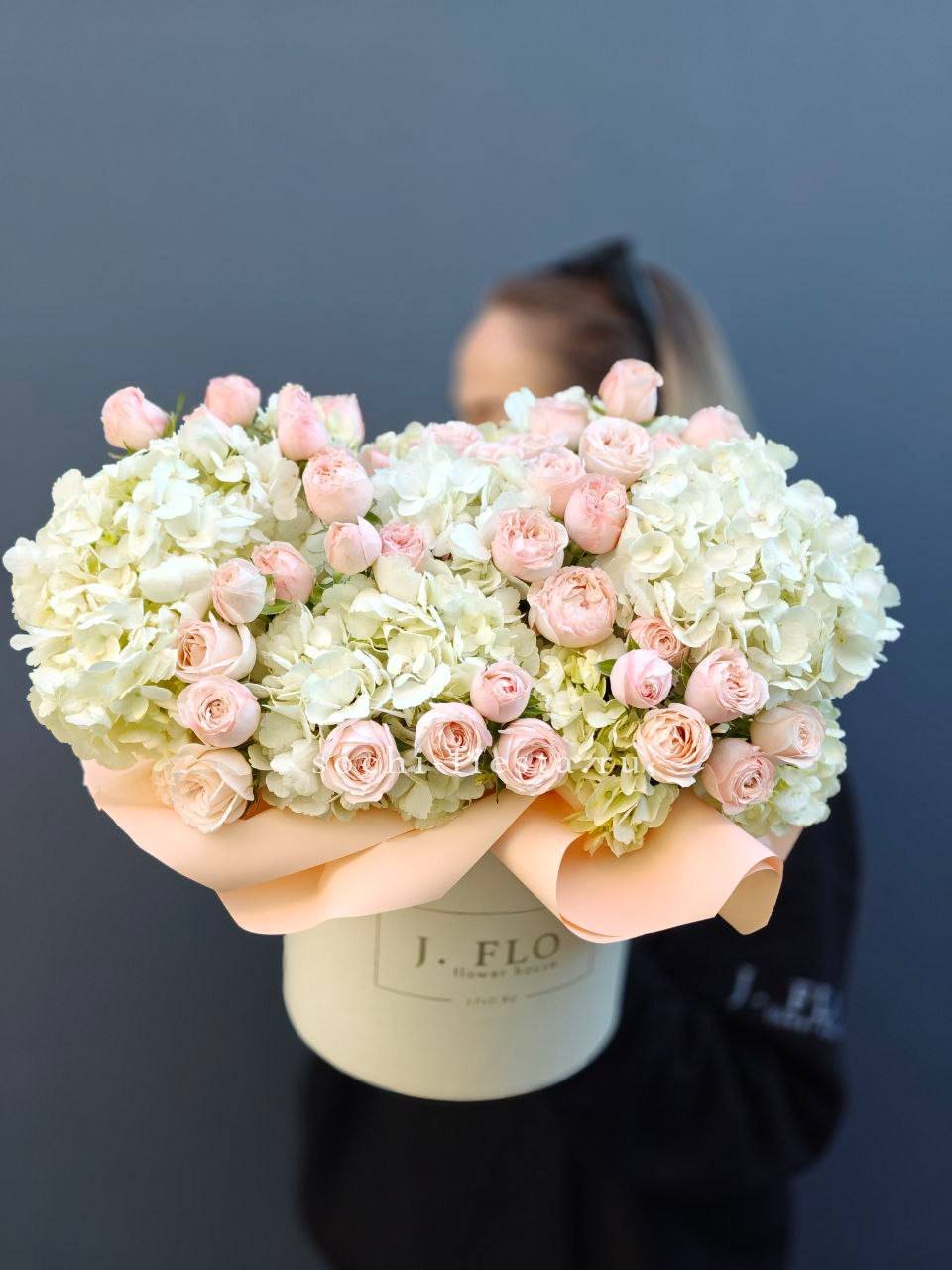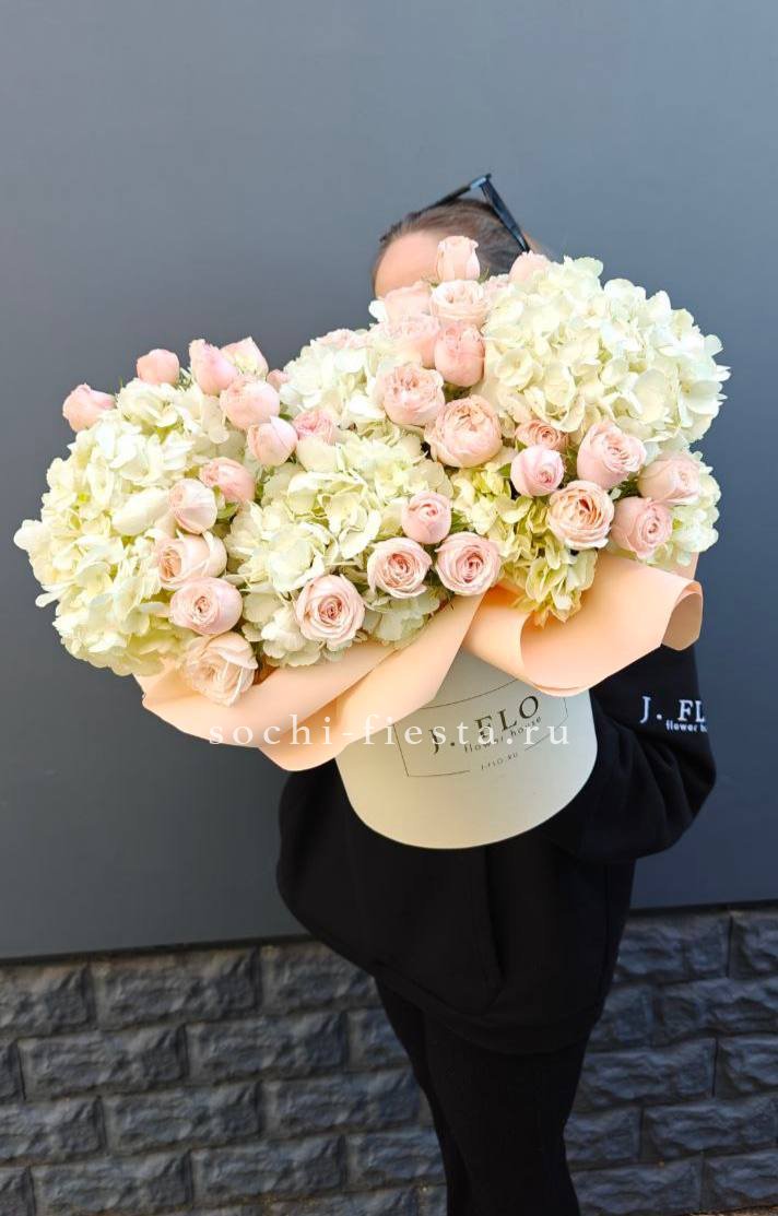 Пионы и гортензия занимают центральную часть, окружённые белыми розами и соцветиями эустомы. Маттиола вносит воздушность в плотно собранную форму.