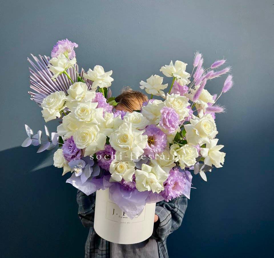 выполнен из эустом, французских роз, эвкалипт, цилиндр D20.