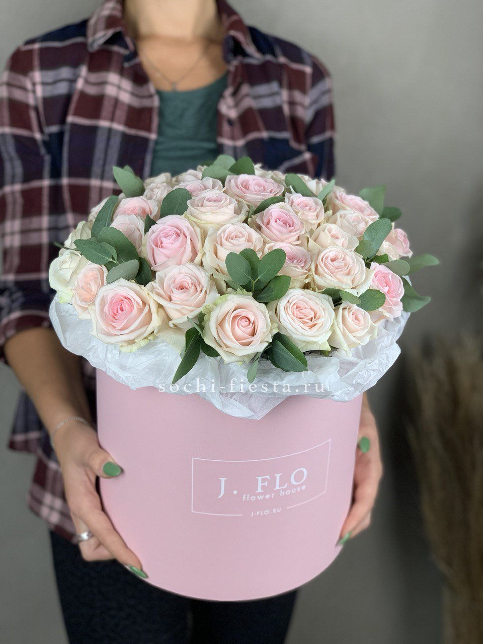 Французские розы и маттиола задают романтичный тон, а амарантус спускается мягкими каскадами за пределы бокса. Перья вносят графичную легкость в общую картину.