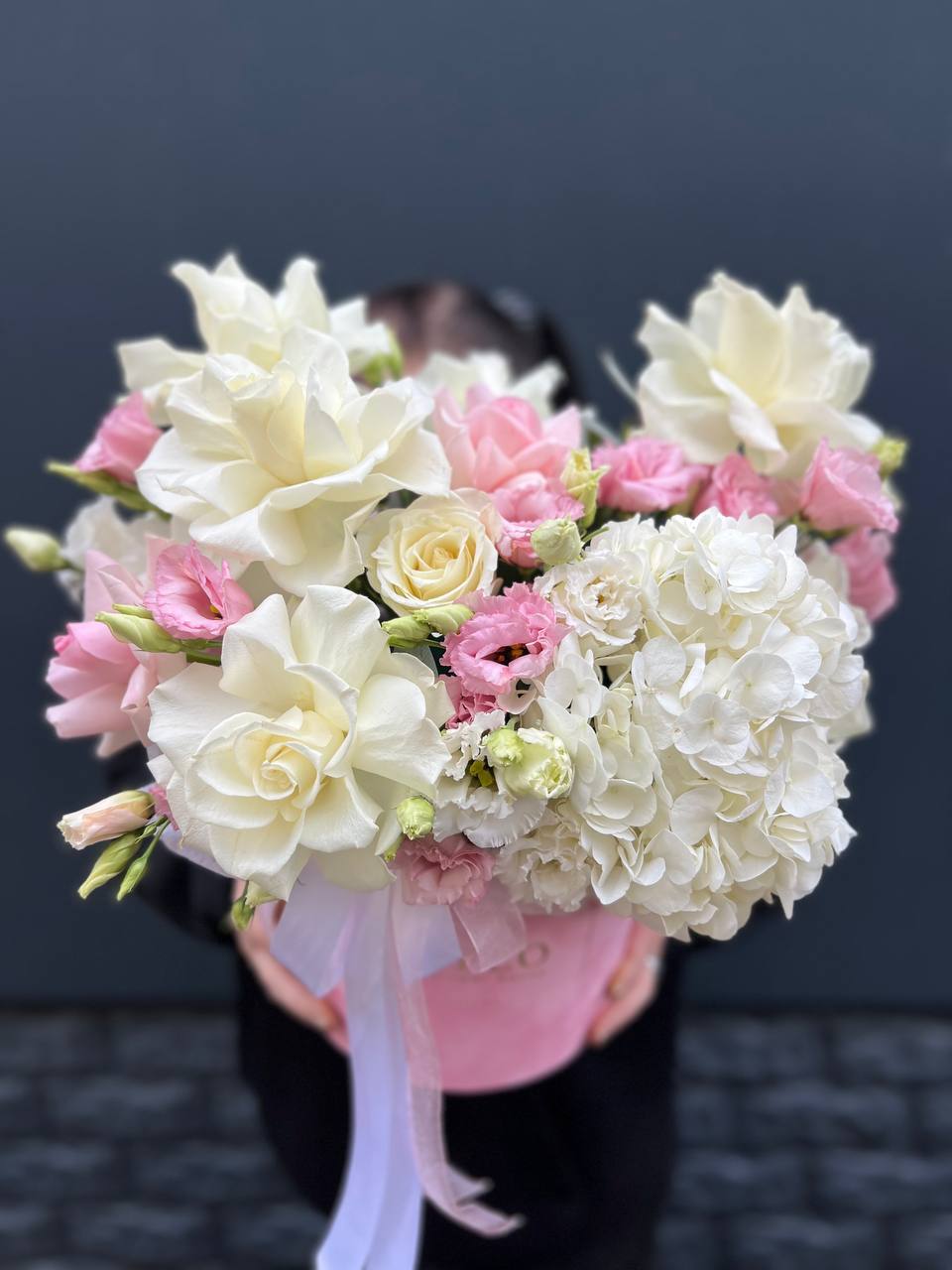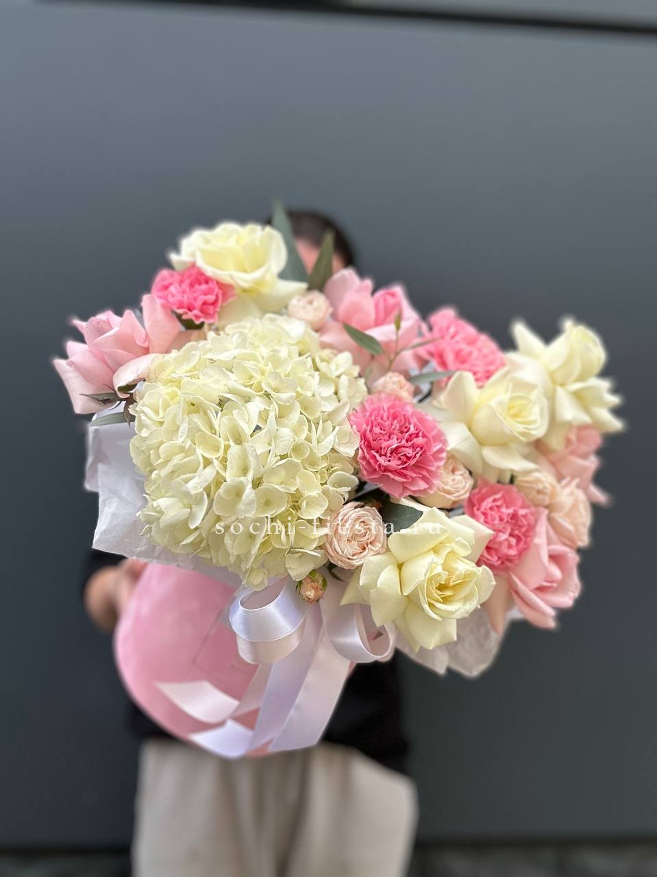 гортензия, одноголовые розы, пионовидные розы, диантусы, лента, цилиндр D20.
