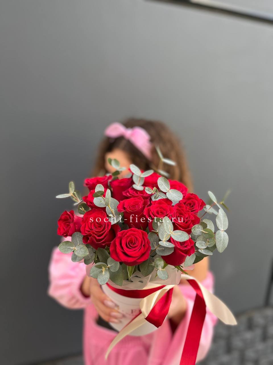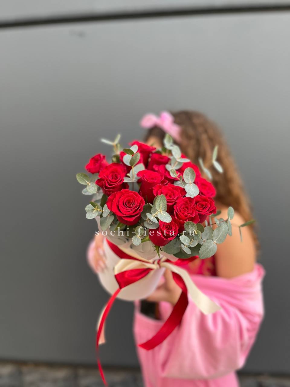 7 пионов, эвкалипт, лента, цилиндр D13.