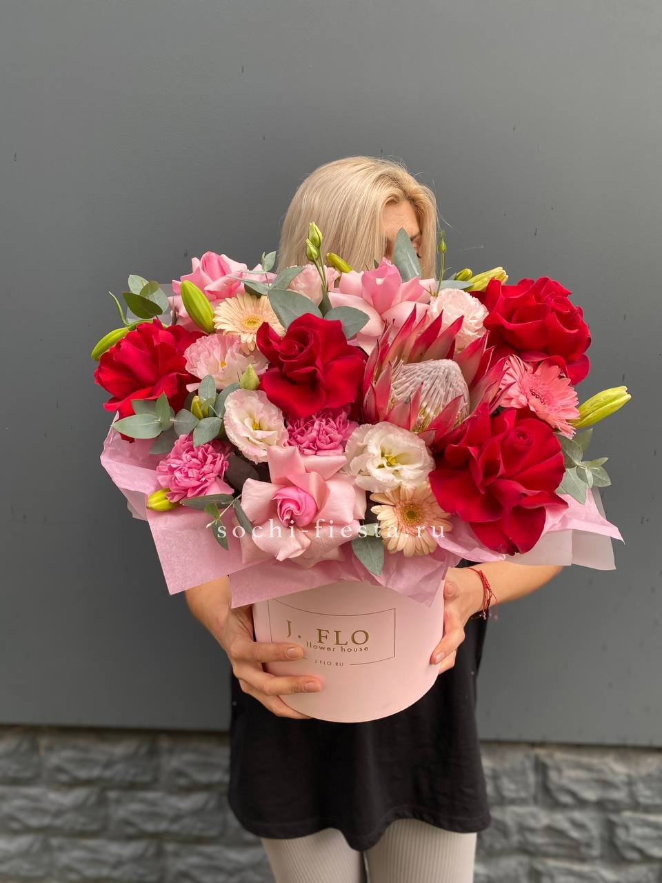 розы, протея, диантус, гербера, эустома, лилия, бокс 20.