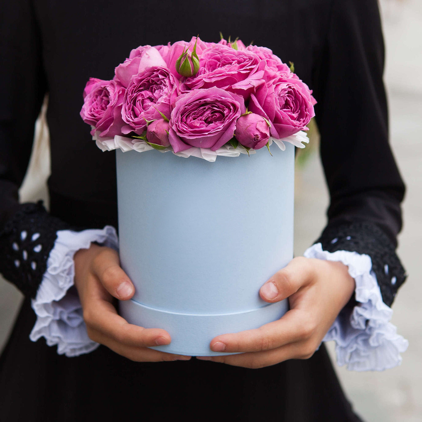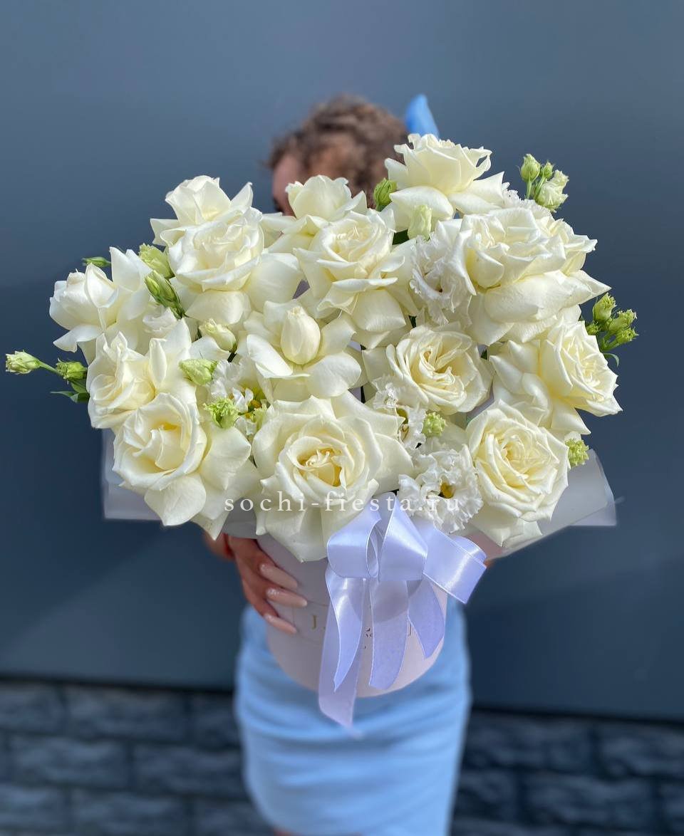 Пионовидные кустовые розы собраны плотно, создавая объёмную композицию с живой текстурой. Лимониум и эвкалипт добавляют воздушности, а цилиндр собирает всё в компактную форму.
