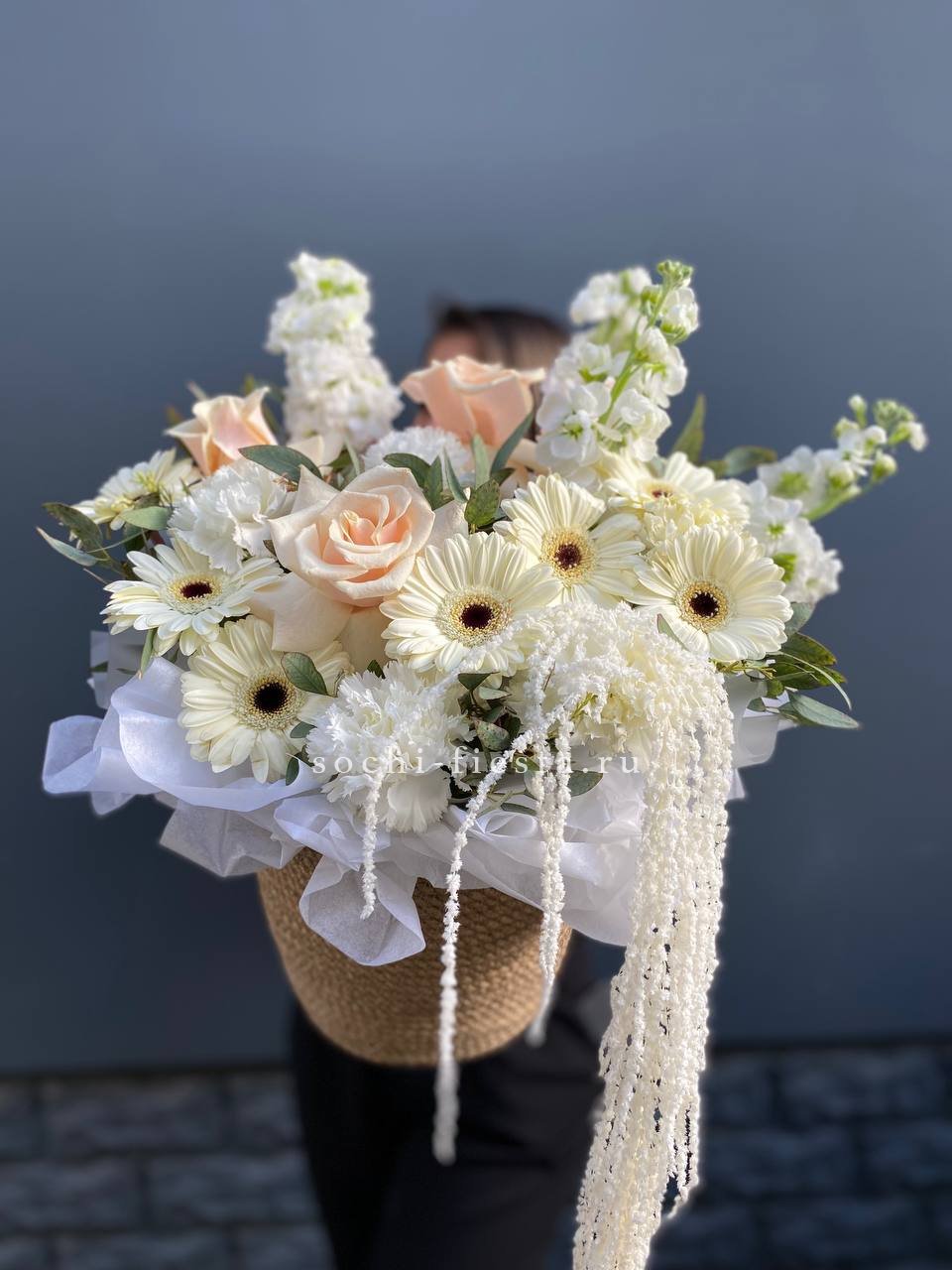 герберы, французские розы, маттиола (аналог), диантусы, амарант и эвкалипт. Цвет роз и диантусов могут отличаться, в тон композиции.