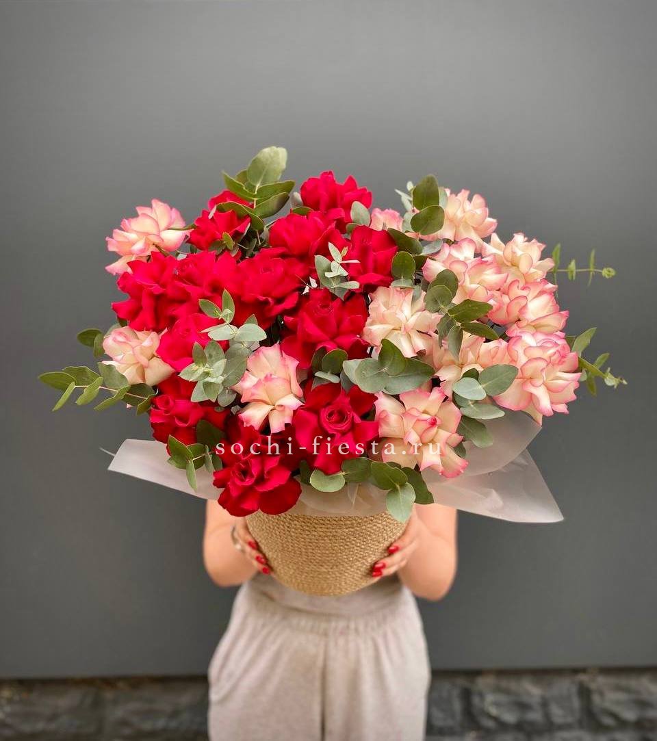 Мягкая палитра белых оттенков с вкраплениями диантуса создает воздушную композицию в натуральном джутовом кашпо. Кустовые розы добавляют объем, а эвкалипт завершает природную гармонию. Готовое решение для интерьера в спокойных тонах.