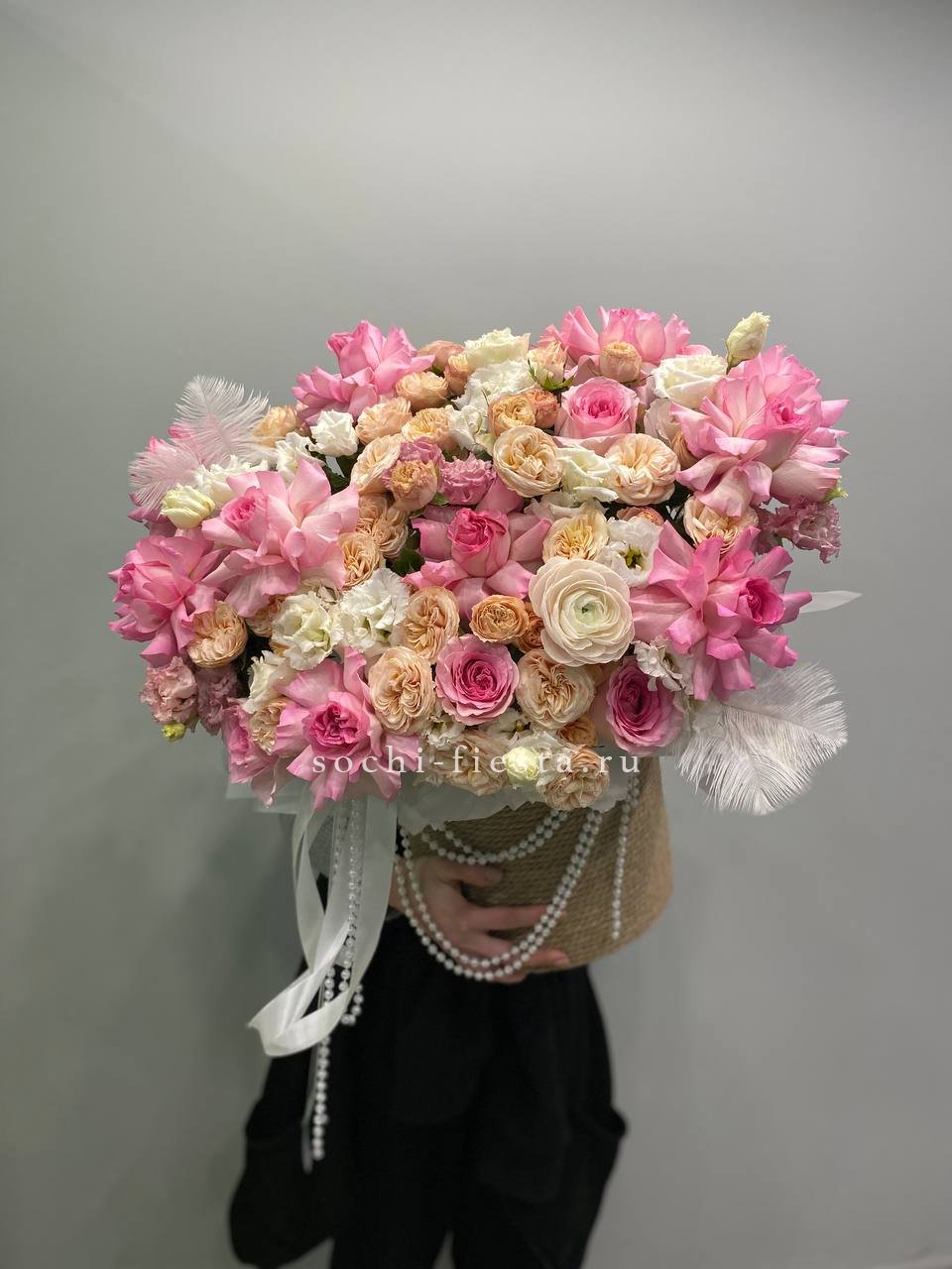 Розовые розы и пионовидные кустовые создают пышный объем, дополненный ранункулюсами и эустомой. Декоративные бусы и перья придают композиции театральность, словно застывший момент балетного выступления.