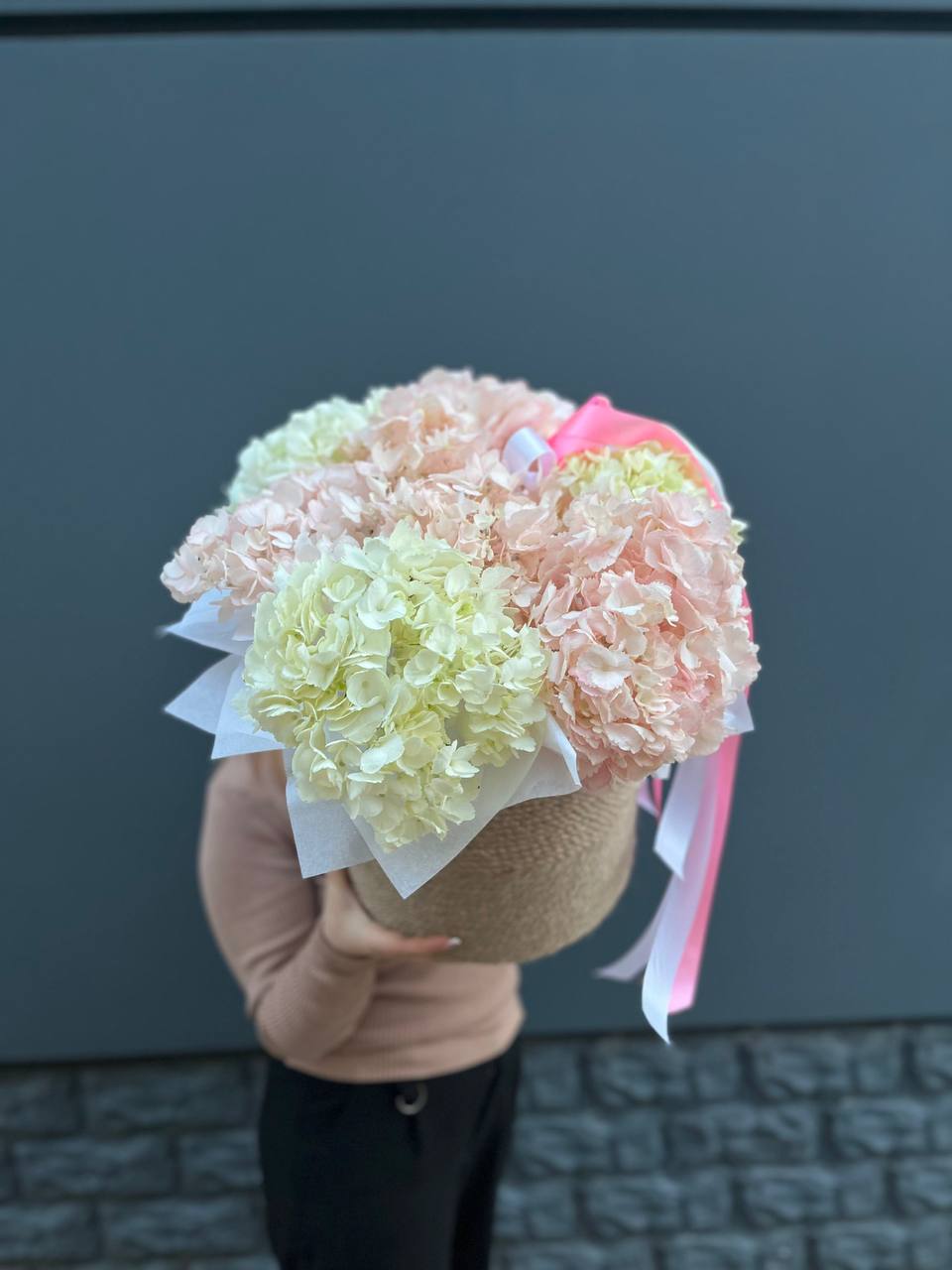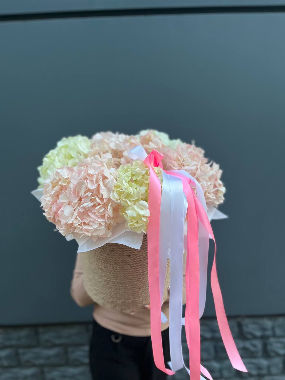 розовые розы, пионовидные кустовые, эустома, ранункулюс (возможна замена в зависимости от сезонности) в джутовом кашпо с элементами бус и перьев.