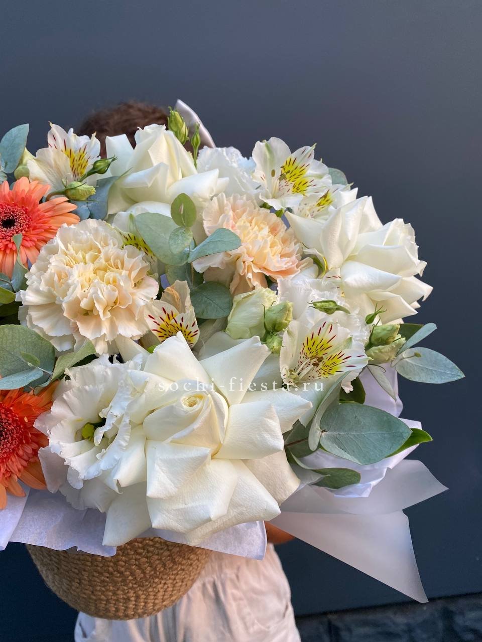 Белые розы и яркие герберы встречаются в одной композиции с диантусами и эустомой. Эвкалипт добавляет зелени, а джутовое кашпо завершает природный образ букета Georgino.