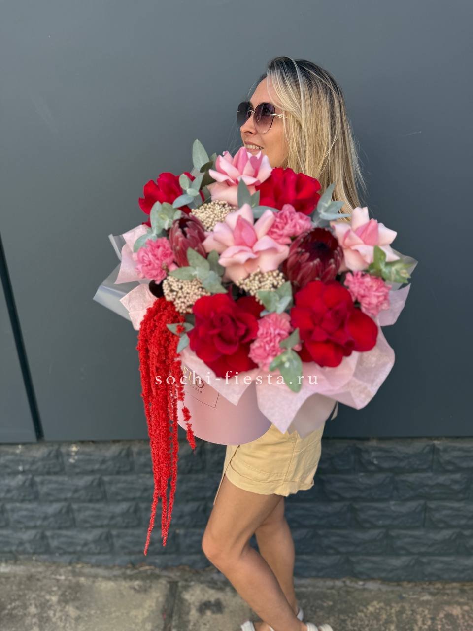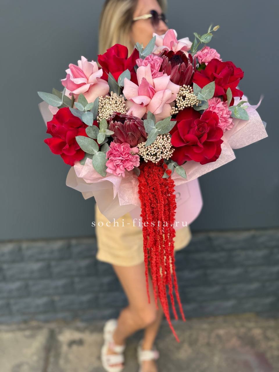 Экзотичная протея задаёт тон всей композиции, где розовые и красные розы переплетаются с фактурным озатамусом. Диантус добавляет графичности, а эвкалипт смягчает линии.