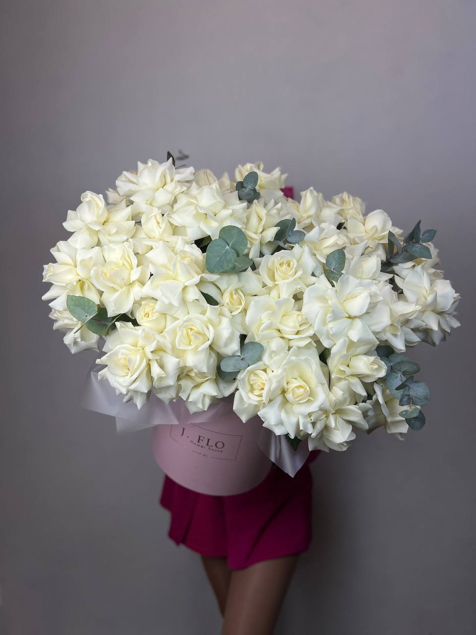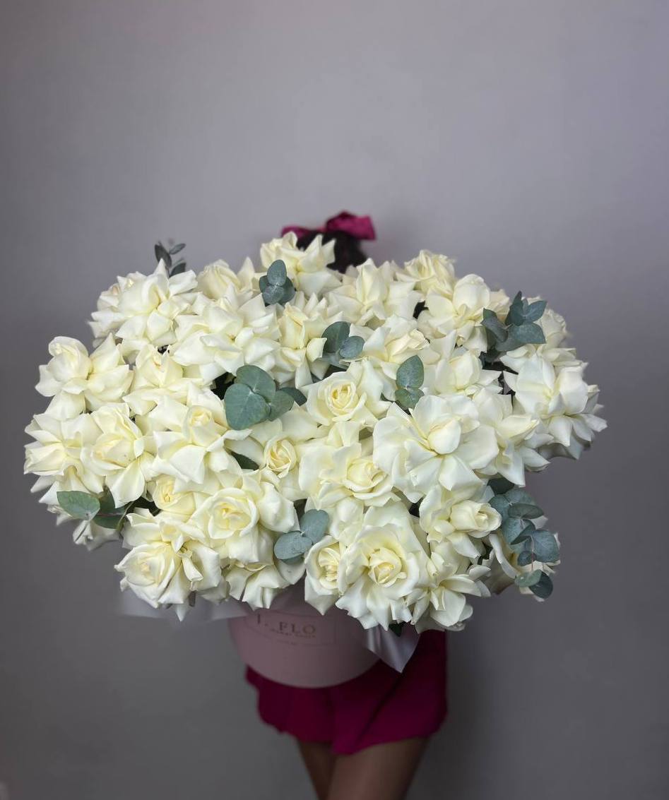 Хризантемы и кустовые розы раскрываются слоями, создавая воздушную текстуру. Эустома добавляет глубину, а эвкалипт формирует естественный контур. Композиция в боксе держит форму и долго сохраняет свежесть.