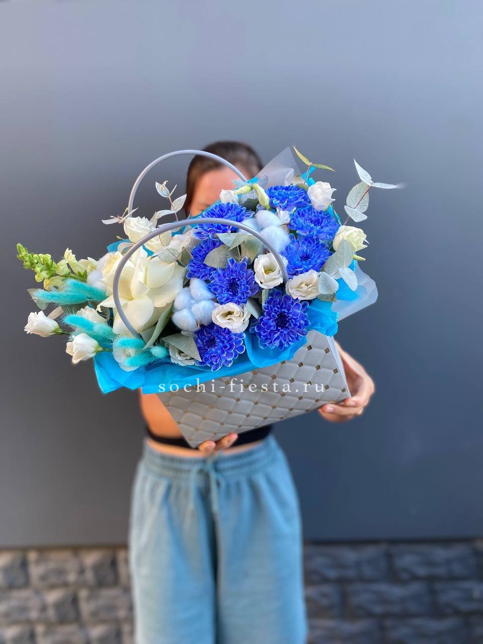хризантемы бигуди, маттиола, розы,  эвкалипт, сумка.