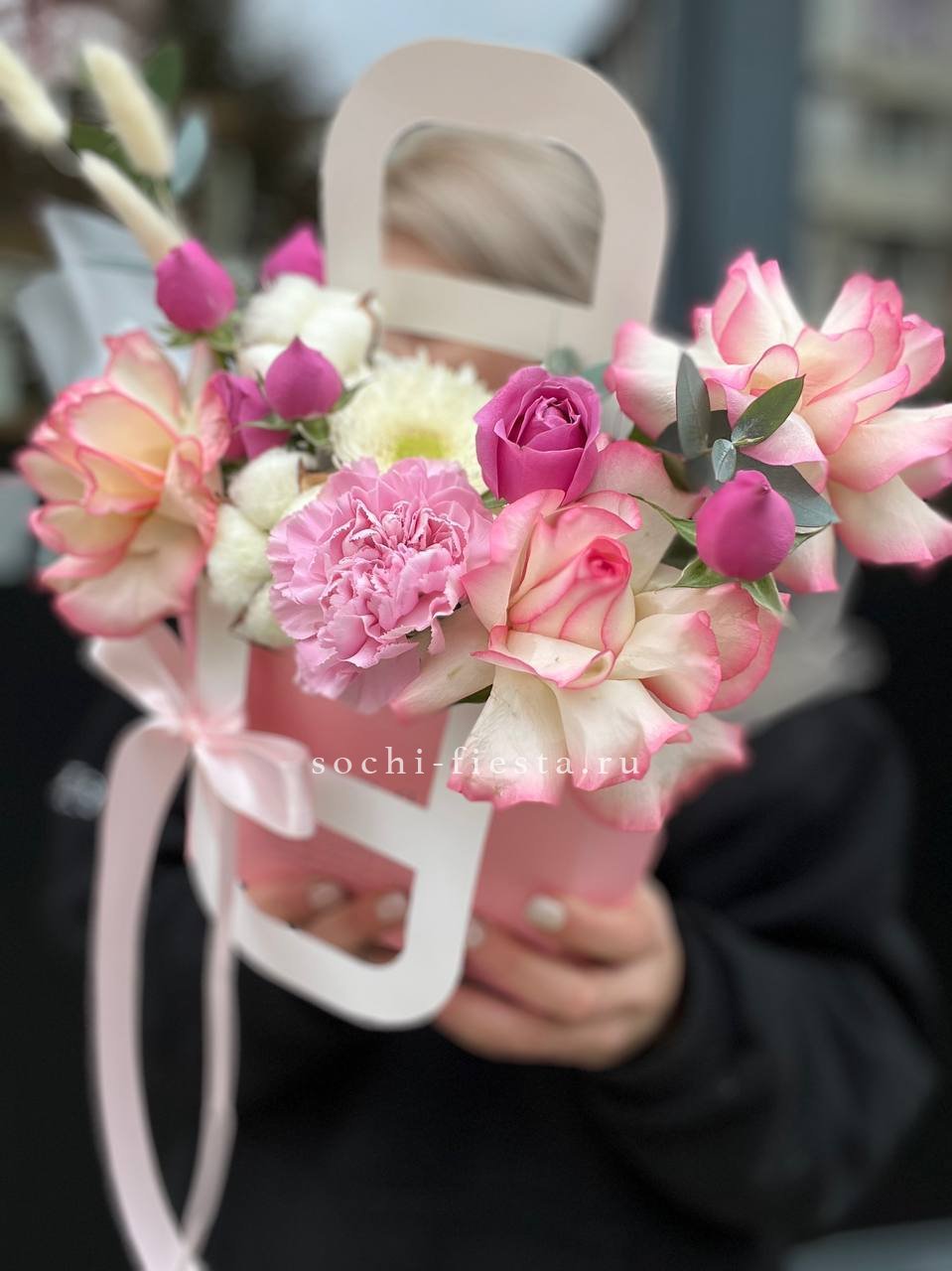 Хризантемы бигуди с их игривой текстурой задают ритм всей композиции. Маттиола добавляет мягкости, а розы завершают образ. Всё это собрано в удобной сумке, готовой к переноске.