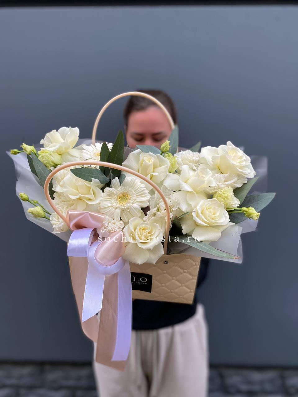 сумочка из гортензии, кустовой розы, герберы и эвкалипта.