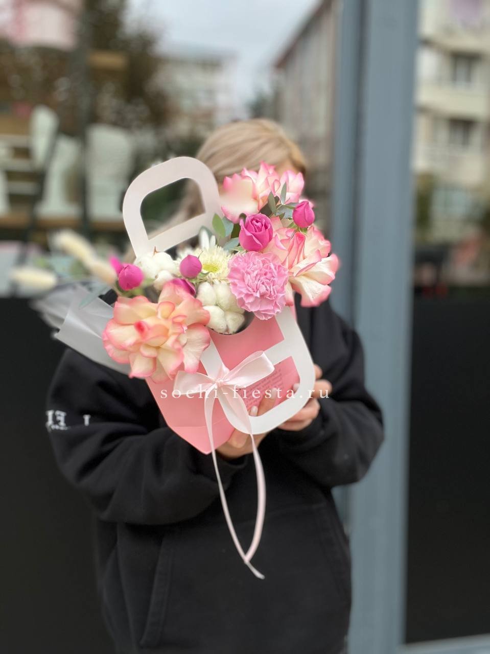 Яркая композиция в удобной сумочке объединяет розы Джумилия с герберами и воздушными соцветиями. Хлопок и лагурус добавляют природной легкости, а диантус создает цветовую динамику.