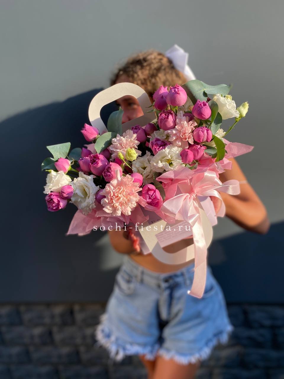 мисти баблс, диантус, эустома, сумочка.