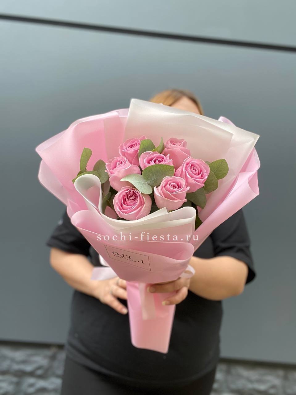 розовая роза - 7 шт., эвкалипт, лента, авторское оформление. Данная цена доступна при единовременном заказе от 10 шт.