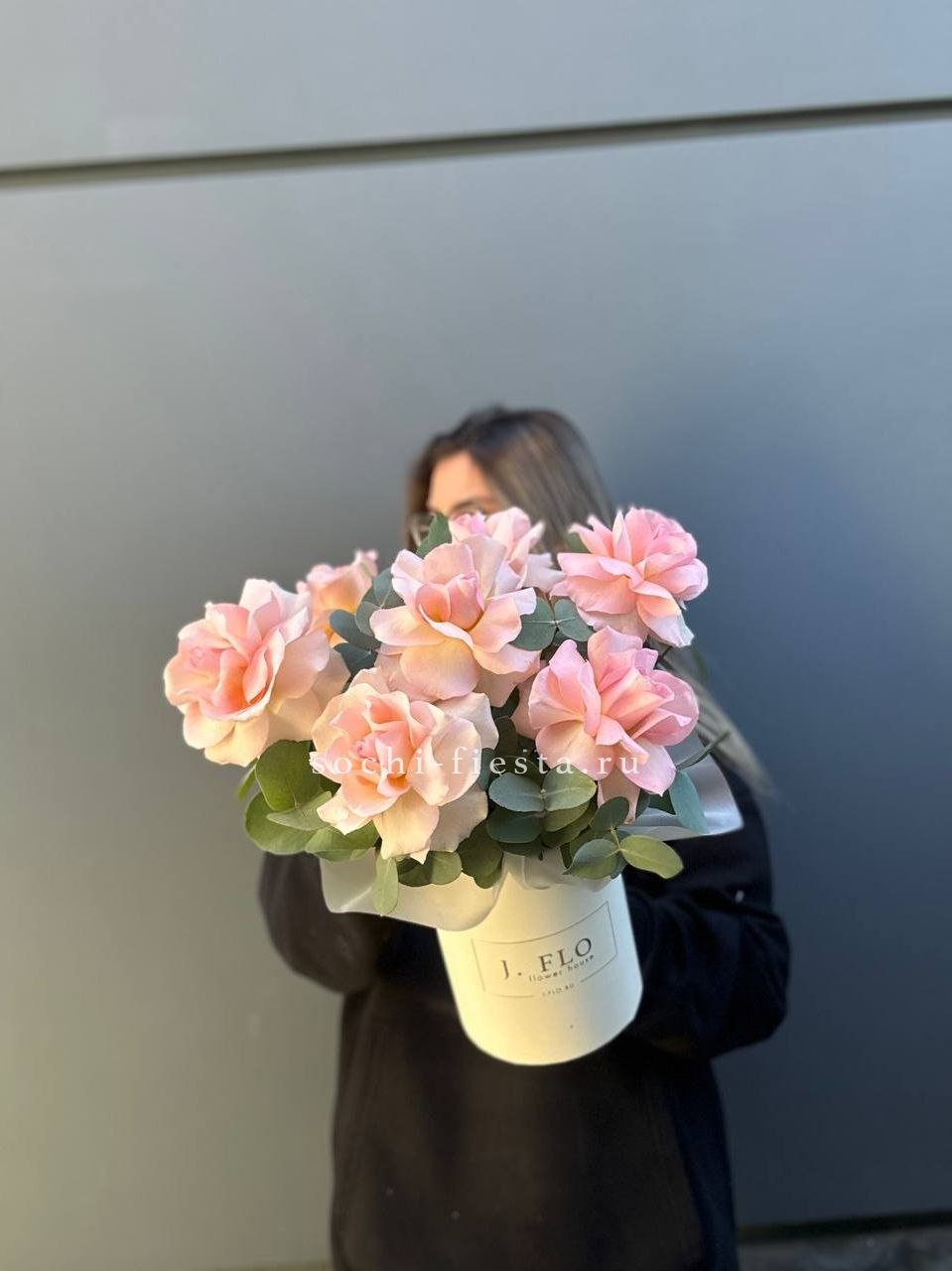 вывернутые розы- 7 шт., цилиндр D13, эвкалипт, лента, упаковка. Данная цена доступна при заказе от 10 шт.