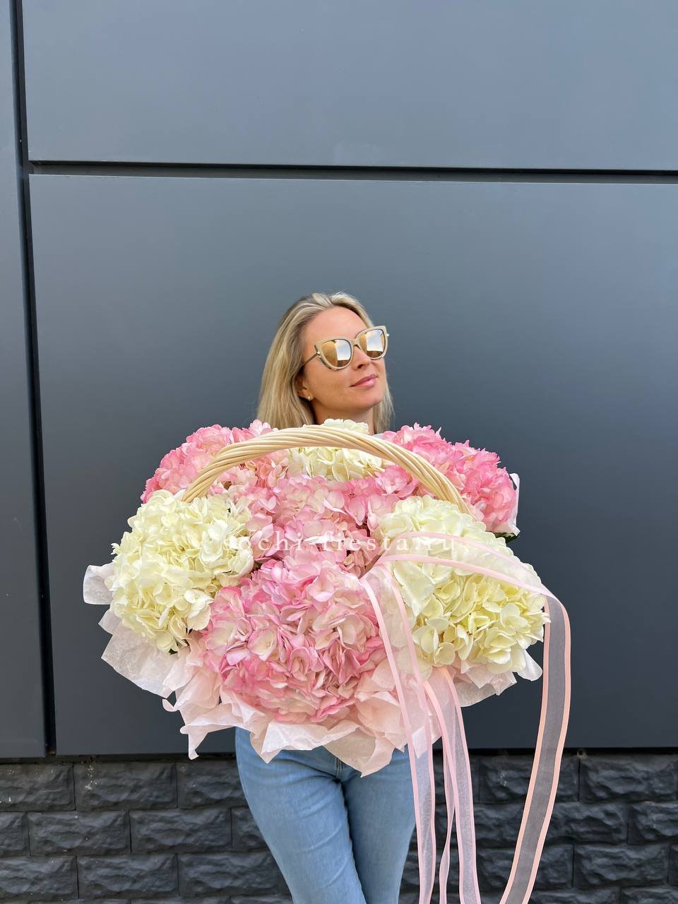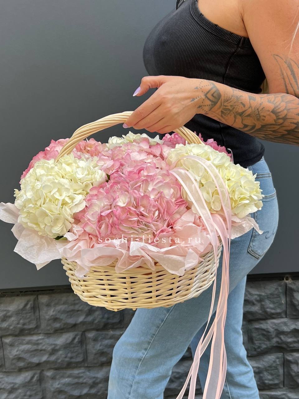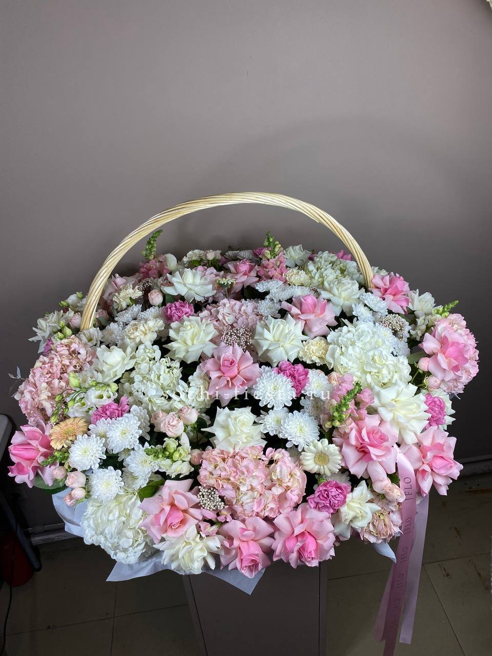 гортензия, эустома, пионовидная кустовая роза, розы одноголовые, диантусы, вспомогательная зелень, лента, корзина D45.