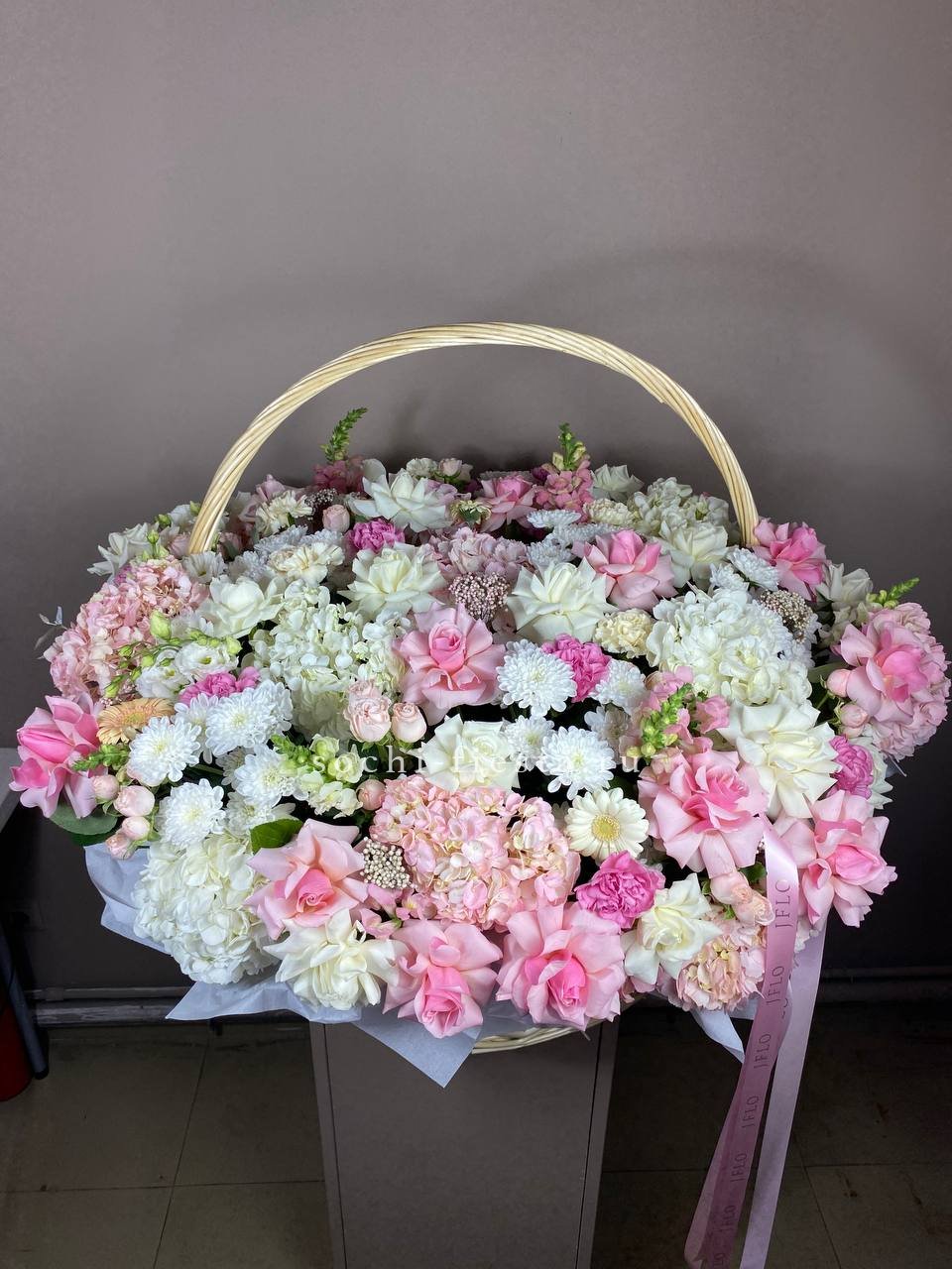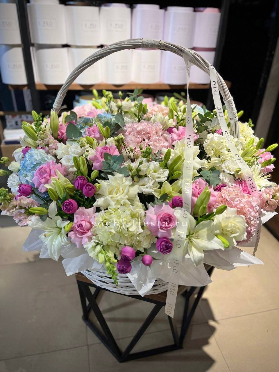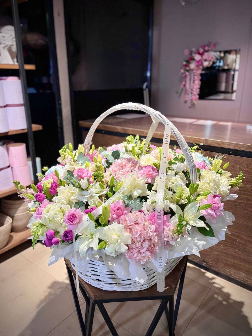 Широкая корзина вмещает пышную композицию из гортензий, эустом и пионовидных роз. Цветы располагаются свободно, создавая впечатление садовой клумбы, перенесенной в интерьер.