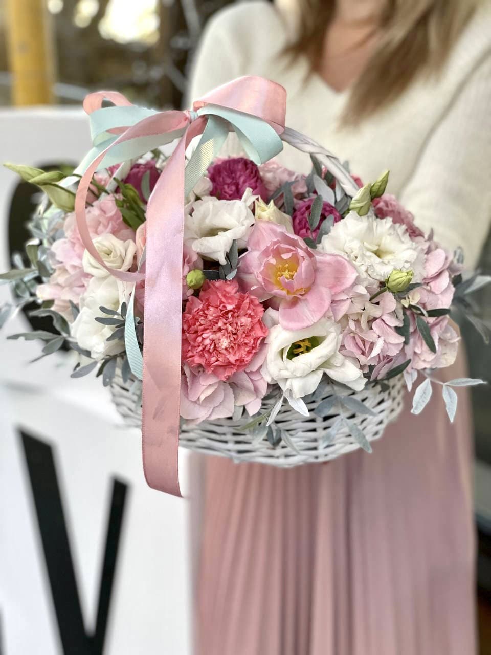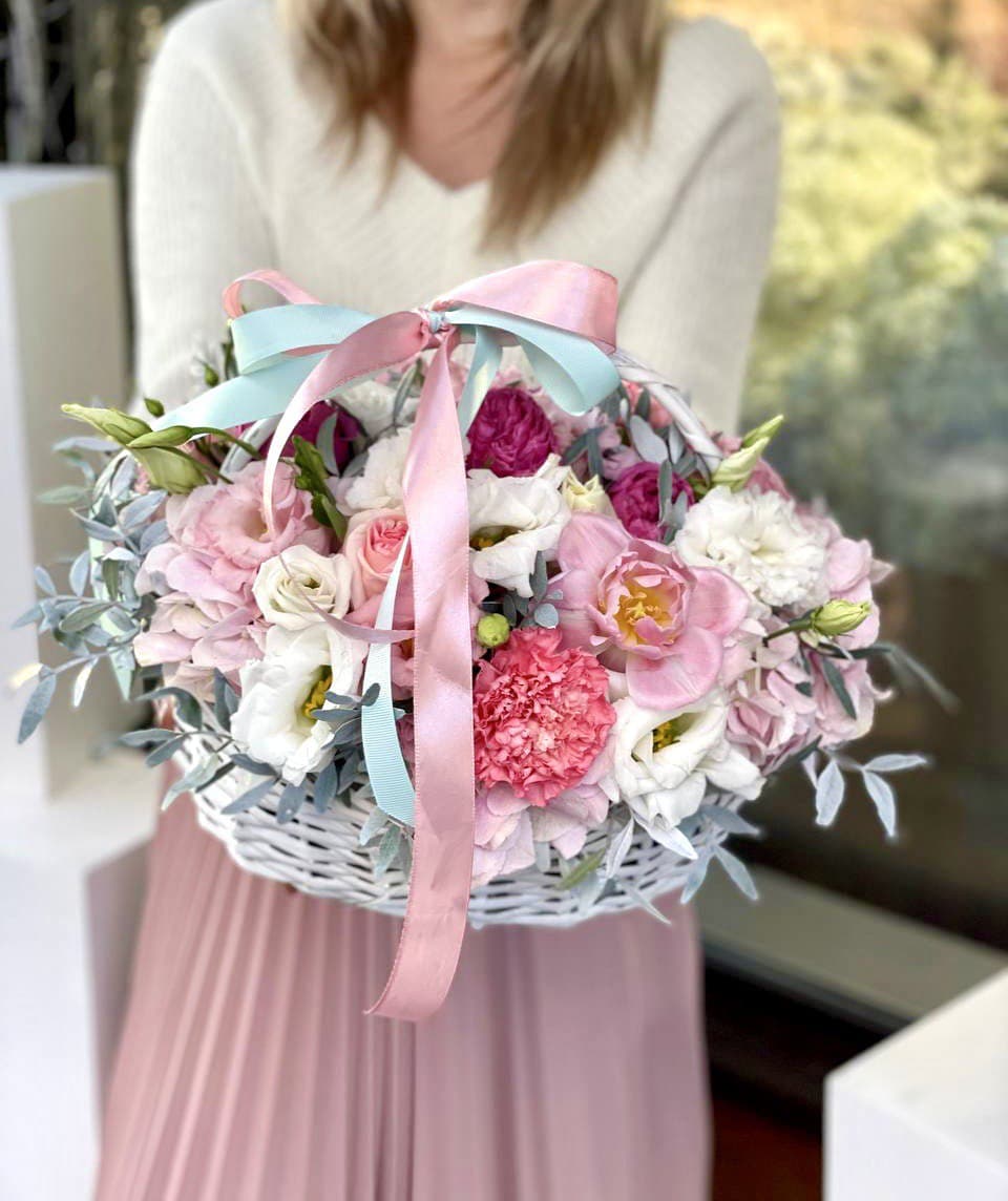 Пышная корзина объединяет пионовидные розы с воздушной гортензией и многослойной эустомой. Матиолла и лимониум добавляют глубину композиции, а диантус создает мягкие переходы между крупными бутонами.