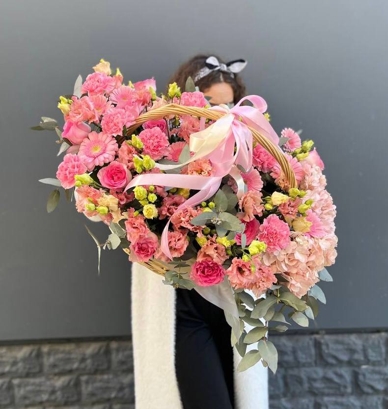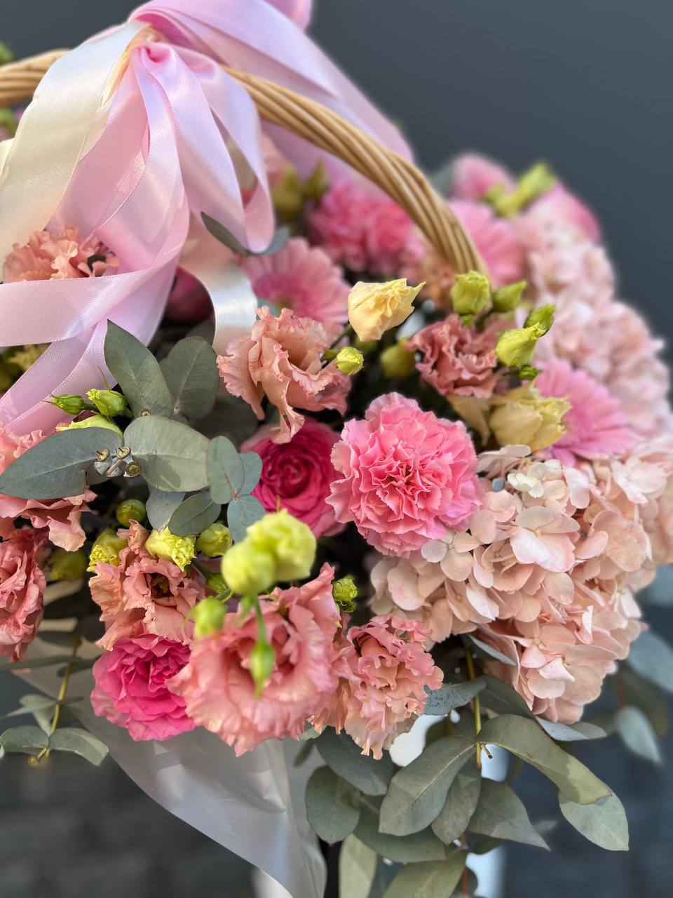 Воздушные соцветия эустомы собраны в округлую композицию с мягким переходом пастельных тонов. Светлая корзина создает легкую базу для объемной цветочной шапки.