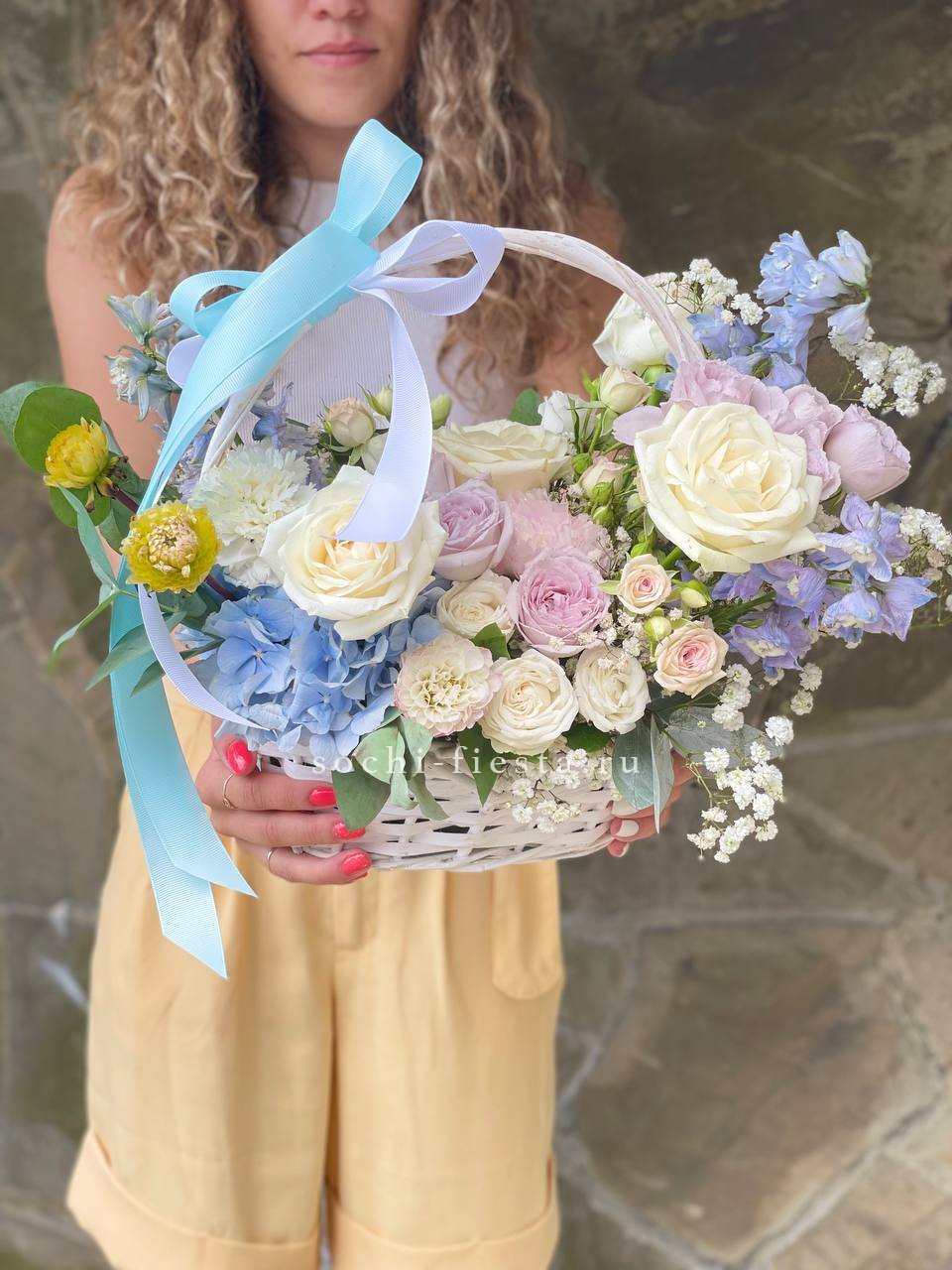 Пышная композиция в плетеной корзине объединяет розы, гортензию, эустому и дельфиниум в единую объемную форму. Маттиола и бомбастик добавляют воздушности, а эвкалипт создает мягкий природный фон. Корзина удобно располагается на любой поверхности и держит форму без дополнительной опоры.