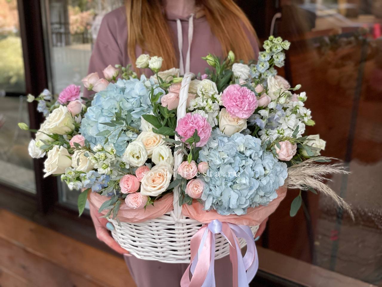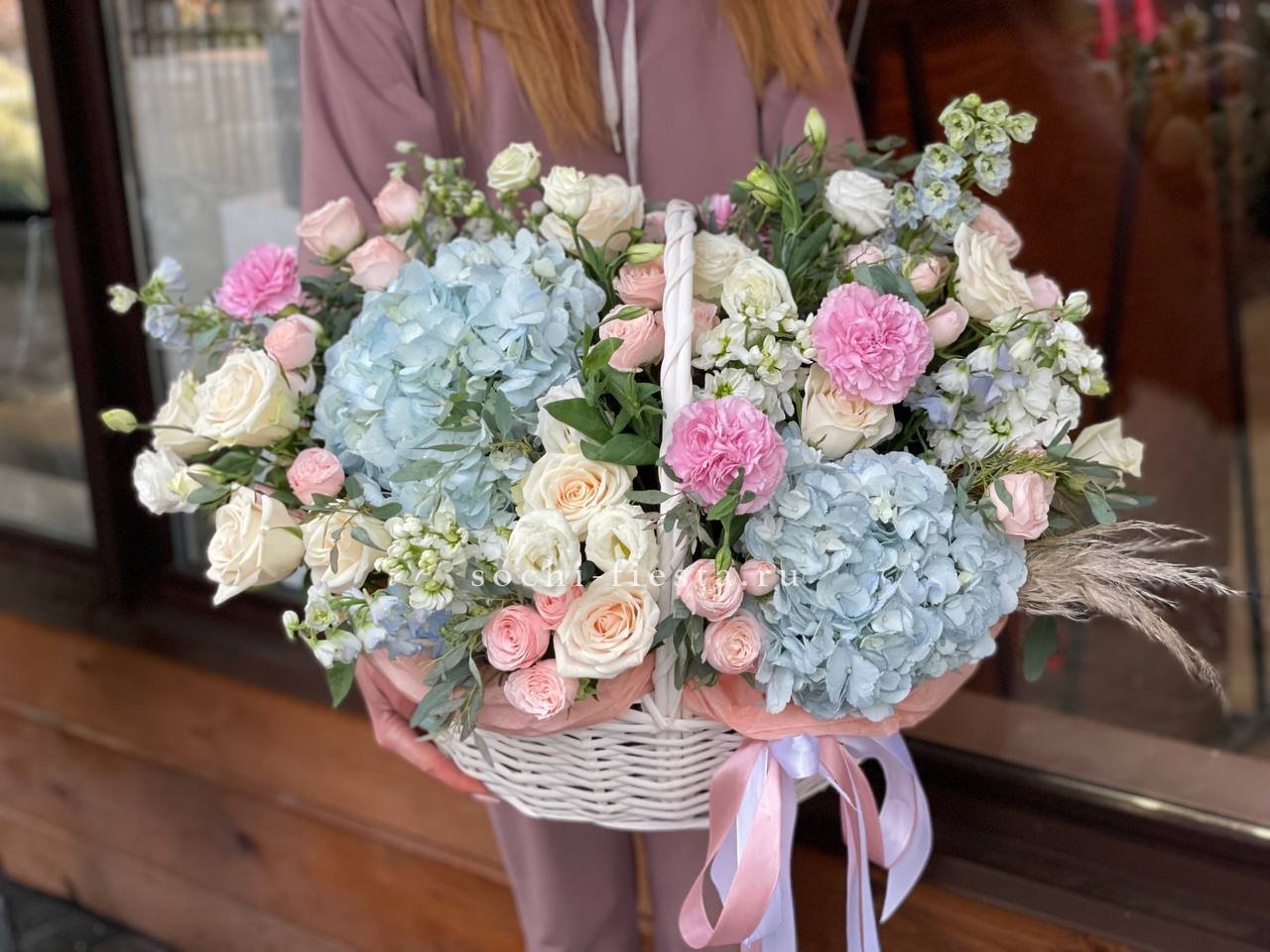 гортензия, бомбастик, эустома, розы одноголовые, дельфиниум (аналог вне сезона), маттиола, эвкалипт, лента, корзина D38.