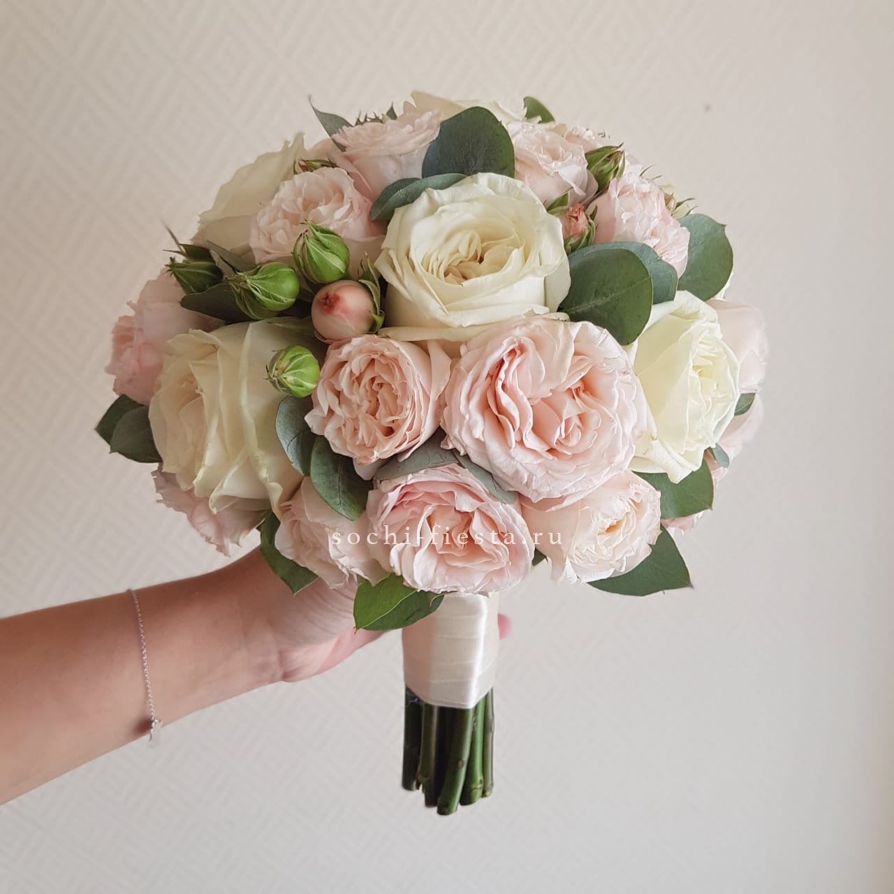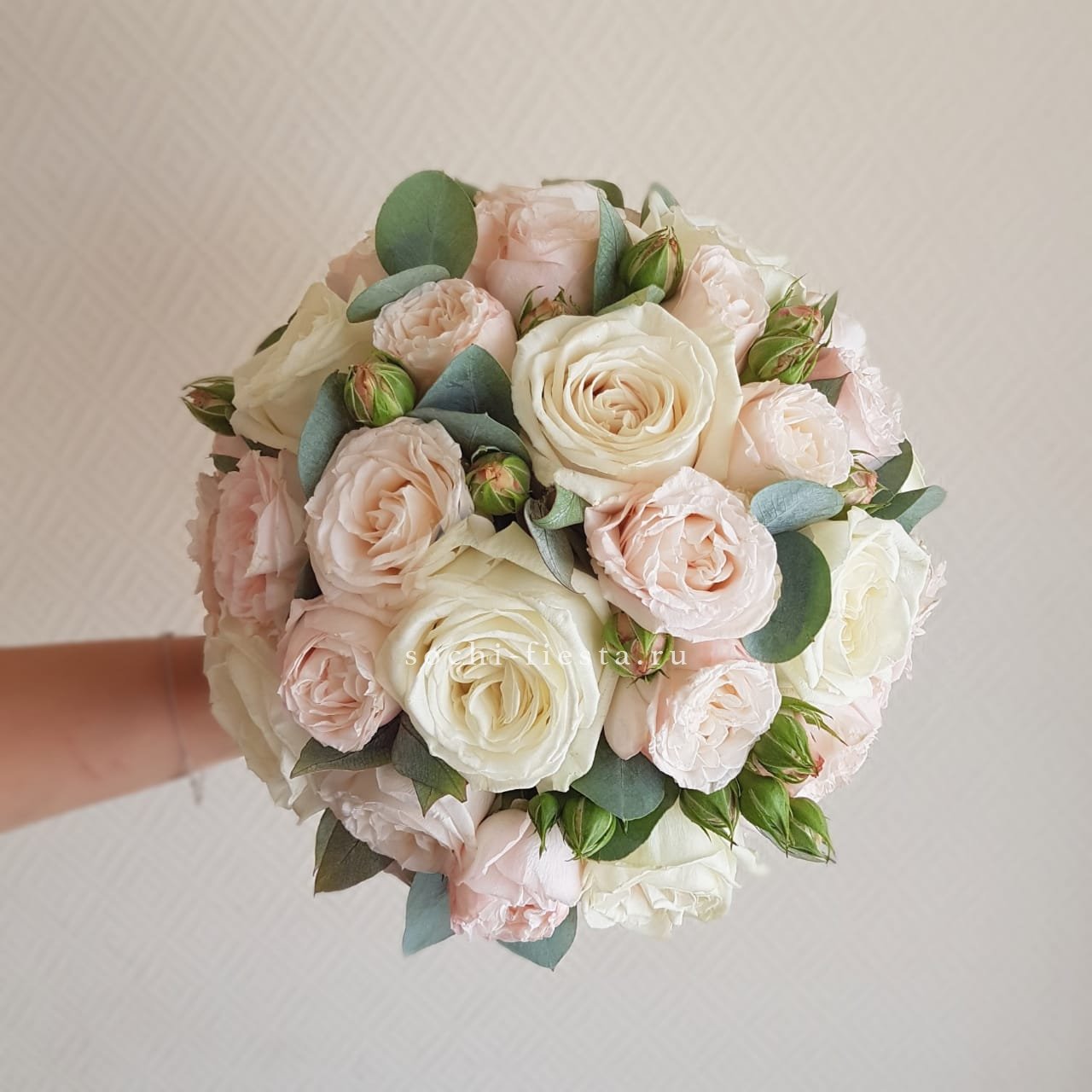 эустома, одноголовые розы, сопутствующие элементы (мелкие цветы или бруния в зависимости от сезона), эвкалипт, лента.