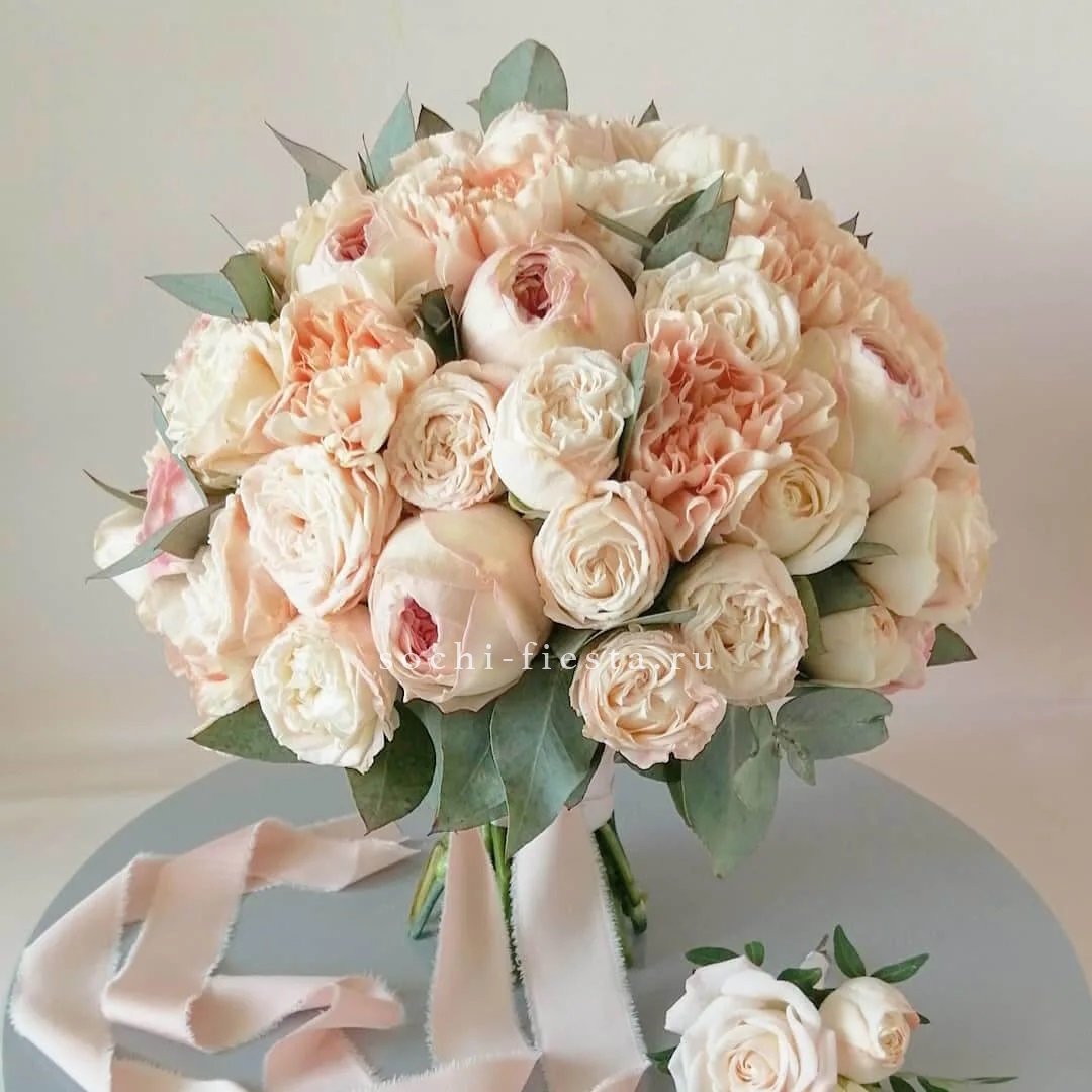кустовые пионовидные розы Бомбастик, одноголовая пионовидная роза (или замена вне сезона на кустовую пионовидную), диантусы, эвкалипт, лента.