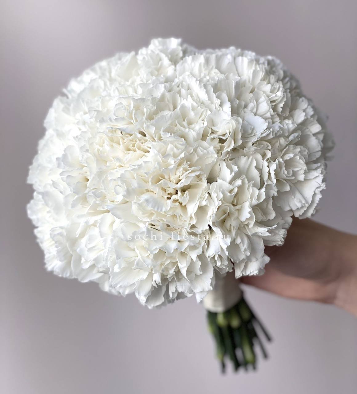 Воздушная сферическая форма с плотной укладкой кремовых и белых бутонов. Пионовидные розы Бомбастик создают объемную текстуру, а диантусы добавляют детали по всей композиции.