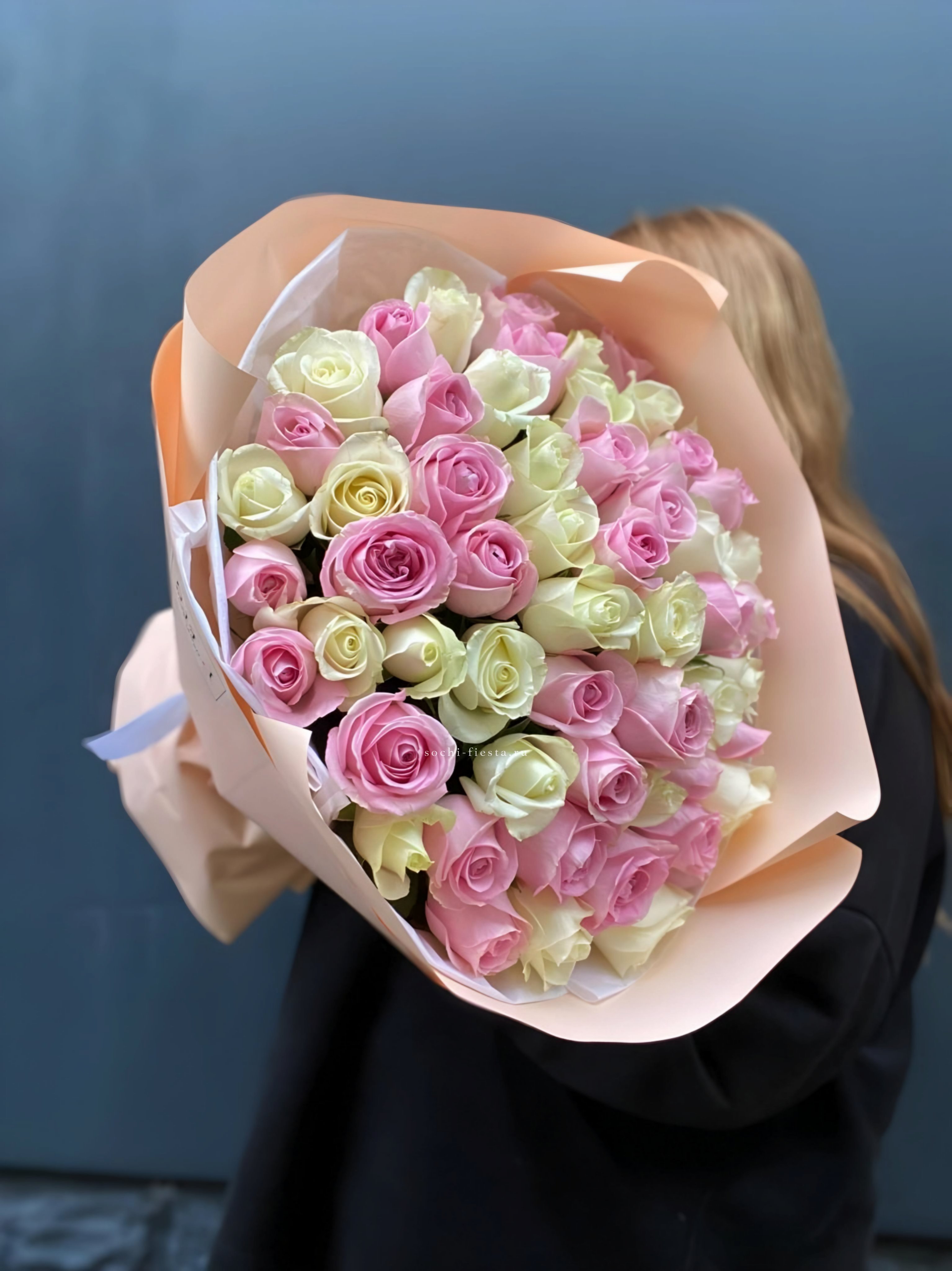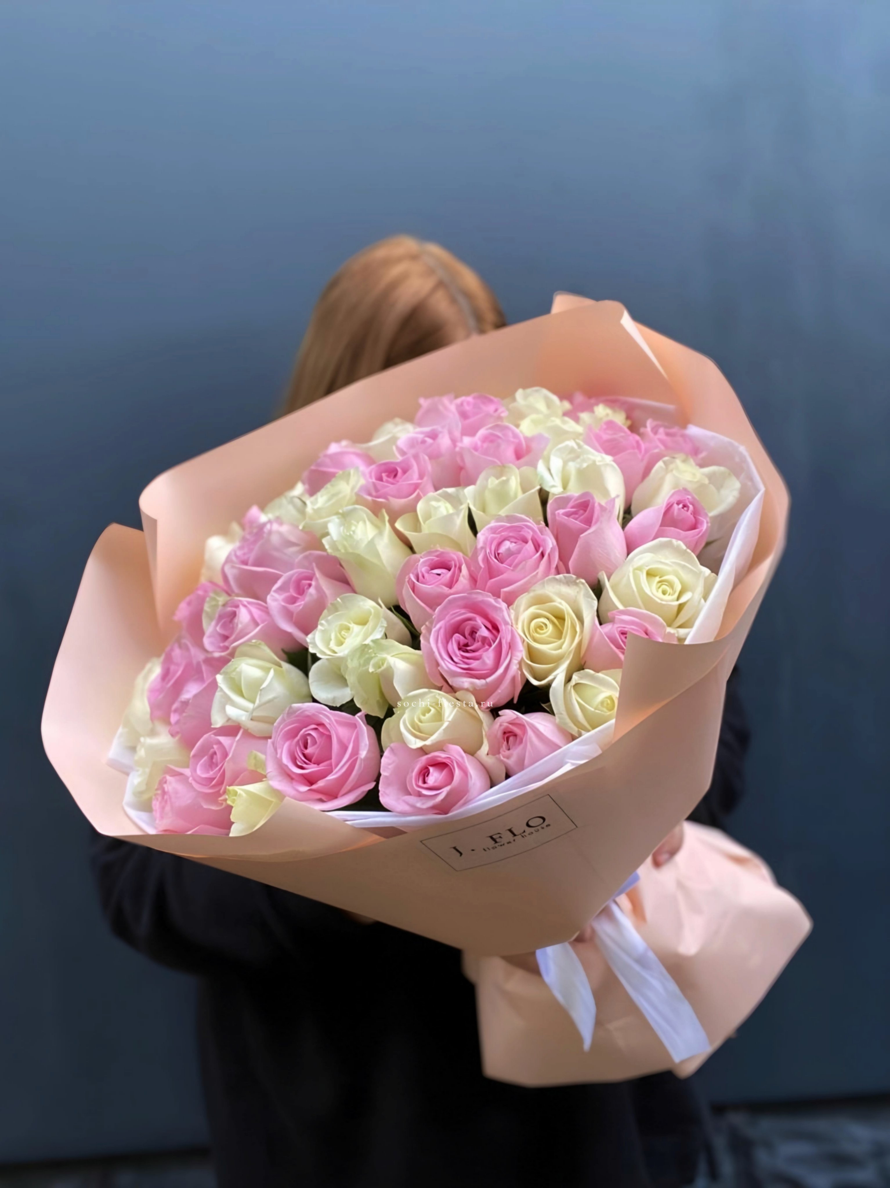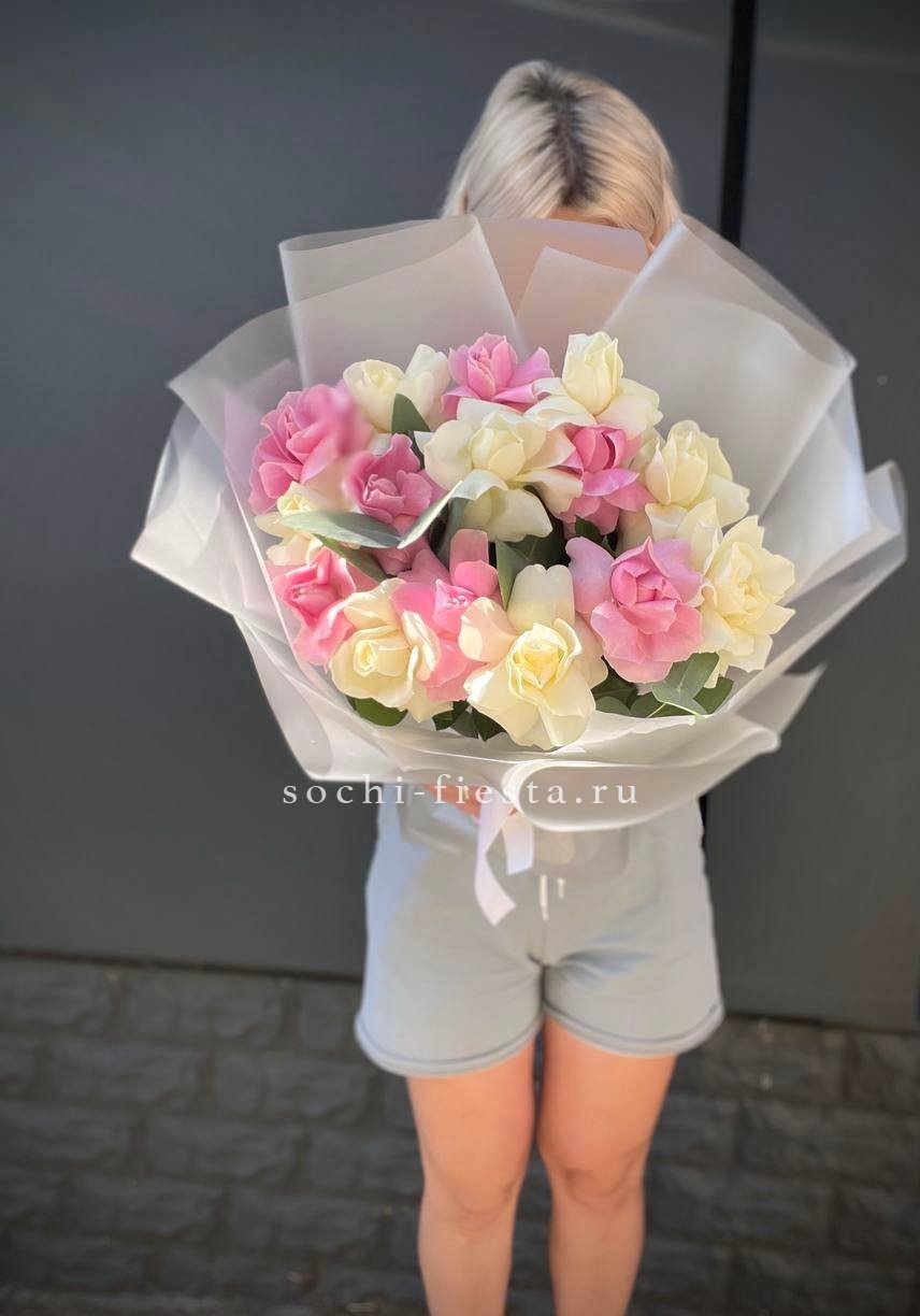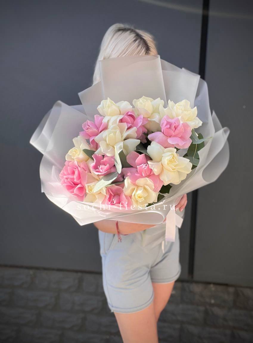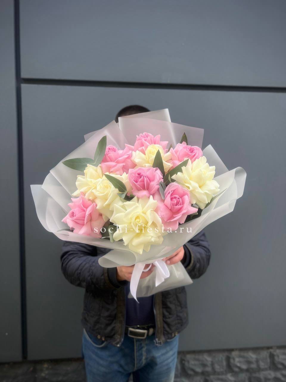 Переход от белого к розовому создаёт мягкую игру тонов. Эвкалипт добавляет фактурности и свежести зелени. Одиннадцать роз складываются в гармоничную композицию с лёгким характером.