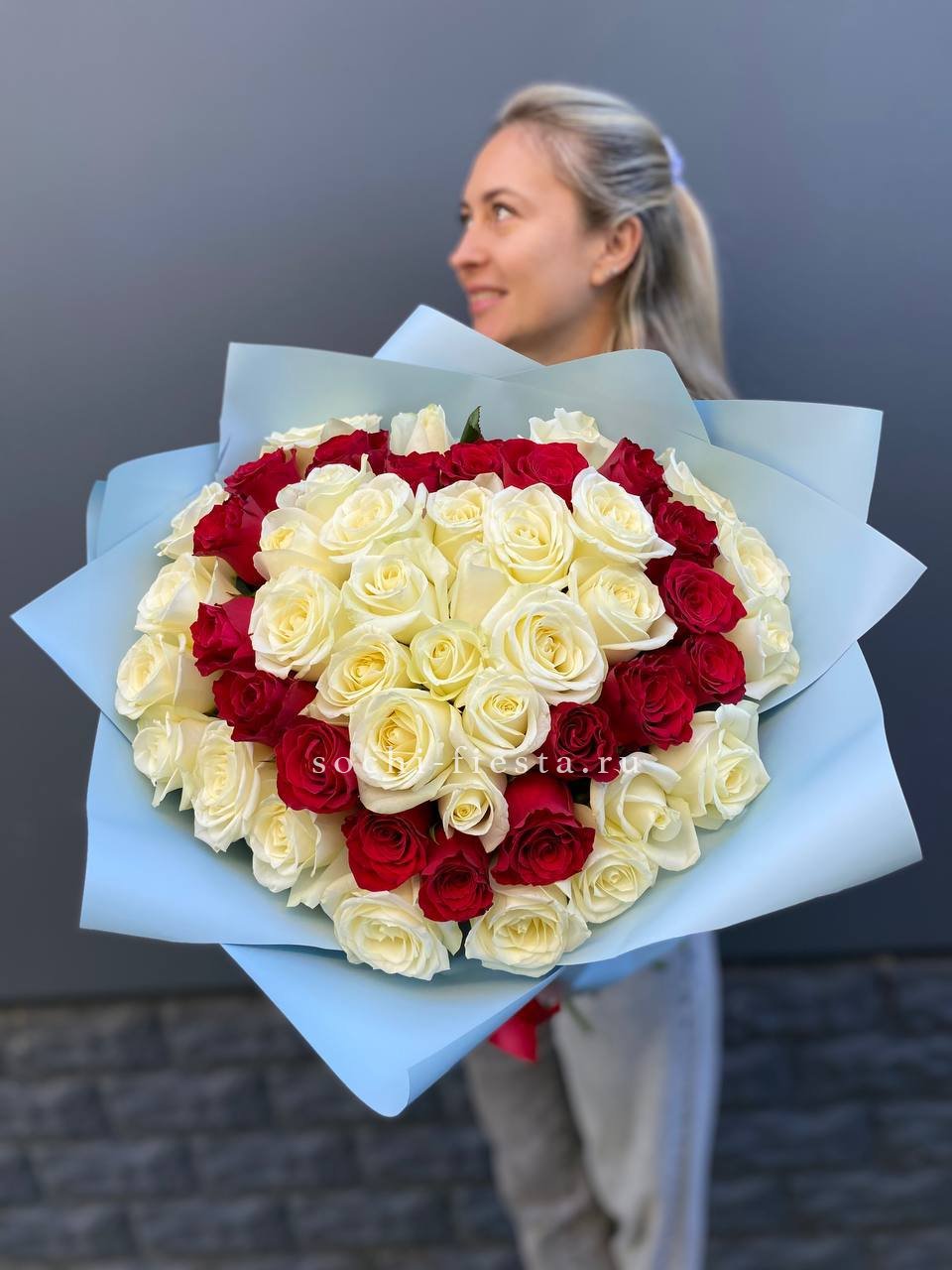 55 роз белого и розового оттенков или же с добавлением кремовой розы, лента, упаковка.