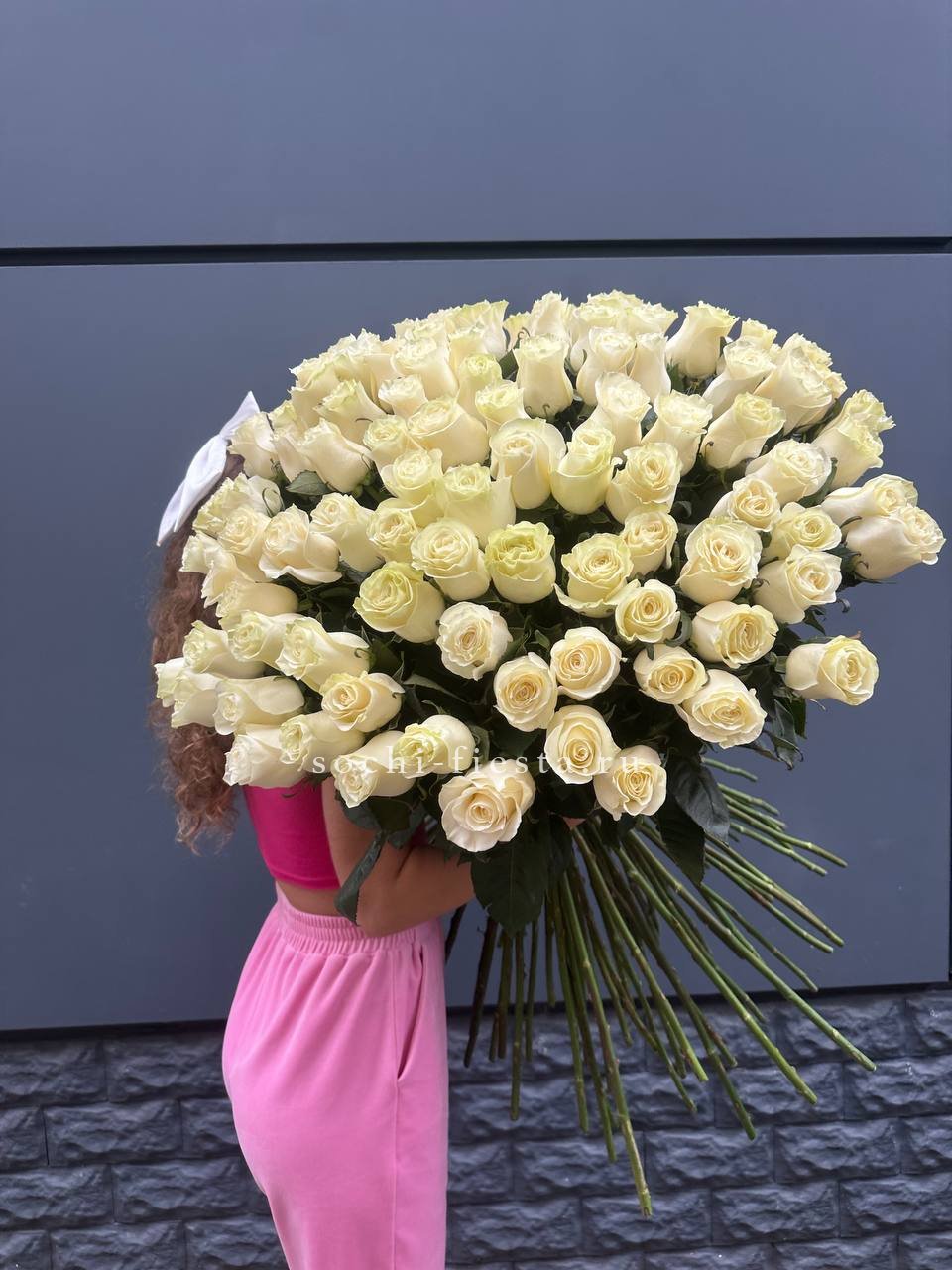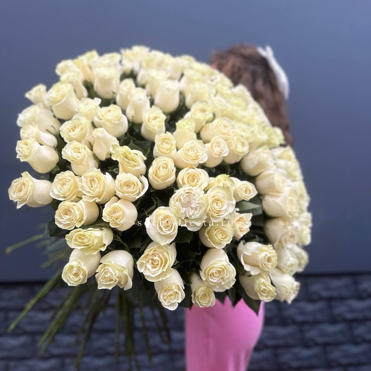 Сто один бутон в бело-розовой палитре создают объёмное облако цвета. Композиция впечатляет масштабом и наполняет пространство мягким сиянием лепестков.