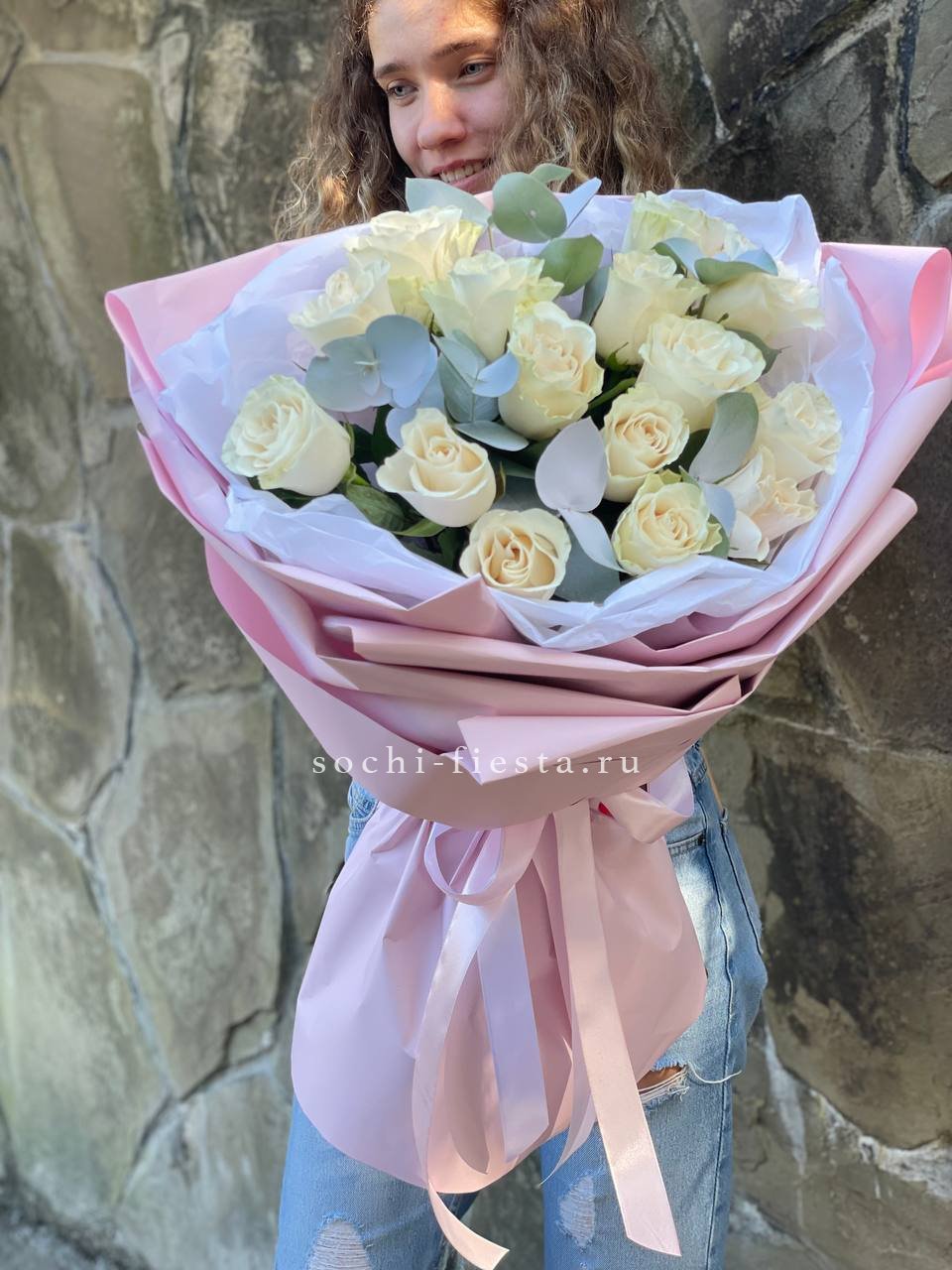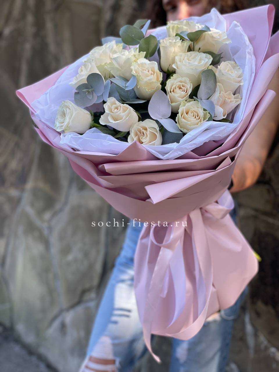 31 белая роза, лента, эвкалипт, белый крафт.