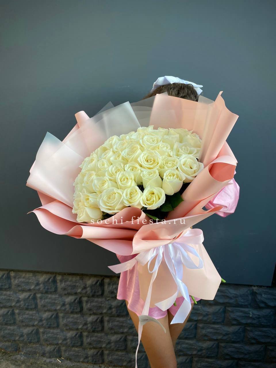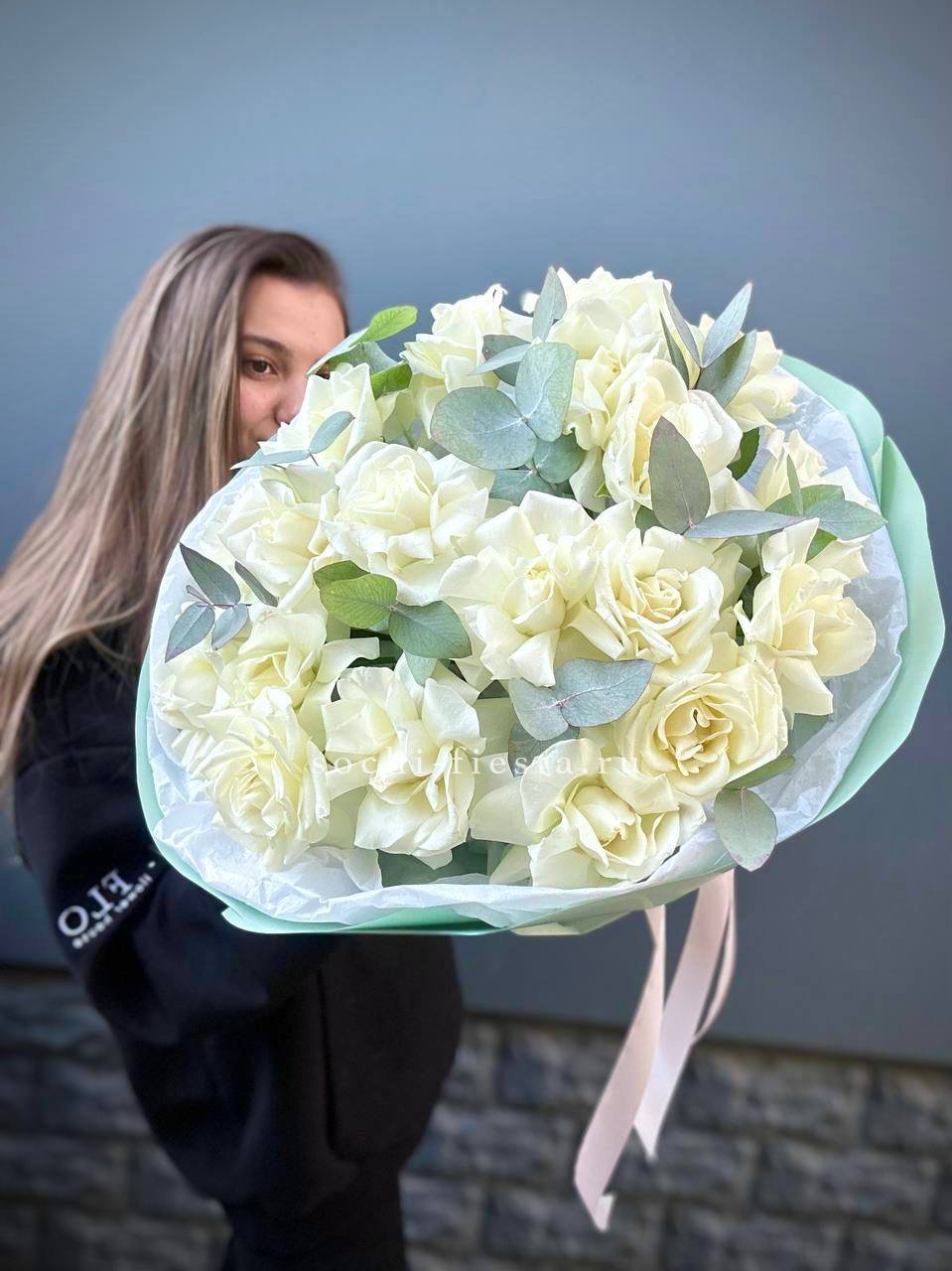 белые розы 35 шт., лента, упаковка на выборВы можете выбрать любое количество.