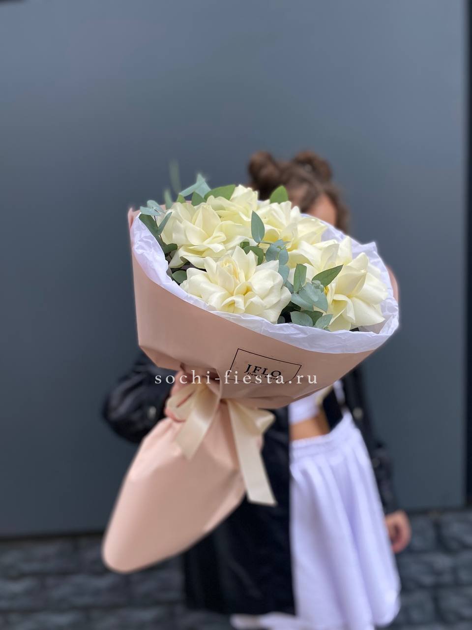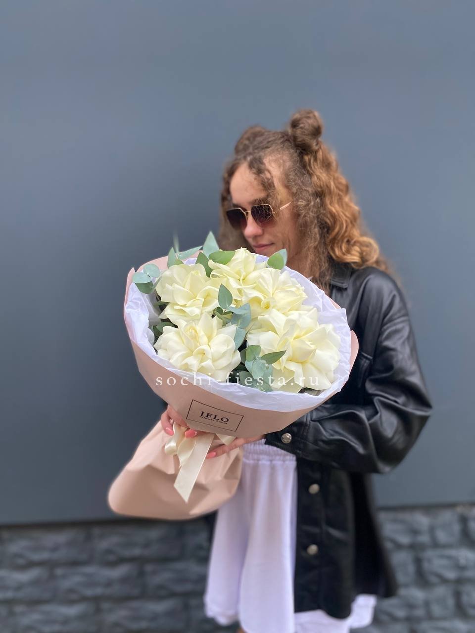 Тридцать пять белых бутонов образуют плотный монохромный ансамбль. Классическая форма и чистота оттенка позволяют букету звучать самодостаточно в любом интерьере.