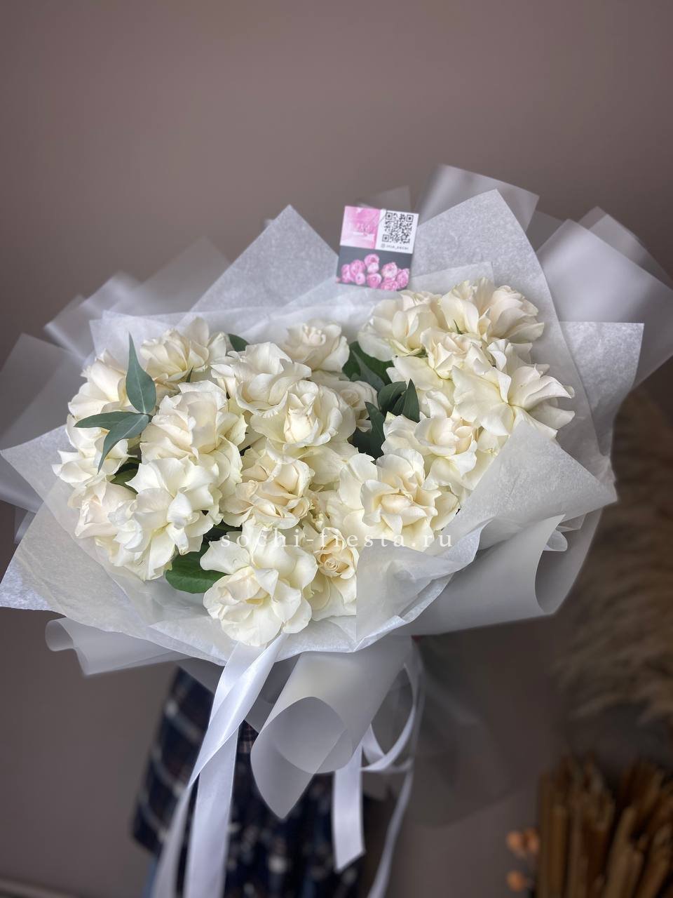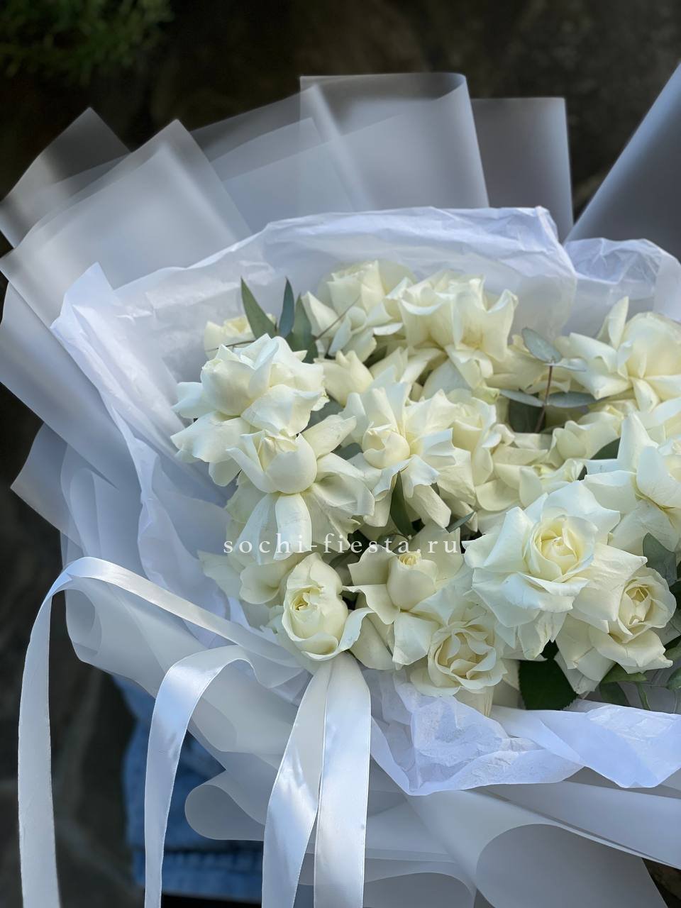 Классический букет из пятнадцати белых роз в упаковке из фоамирана держит форму и остается свежим долгое время. Компактная композиция удобна для транспортировки и размещения в любом интерьере.