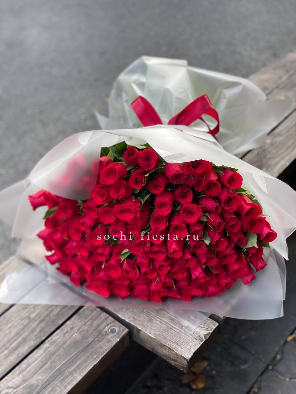 Сто один бутон сорта Лолита раскрывается бархатными лепестками глубокого красного цвета. Высокие стебли формируют объемную композицию с выразительным силуэтом. Классика в современной подаче.