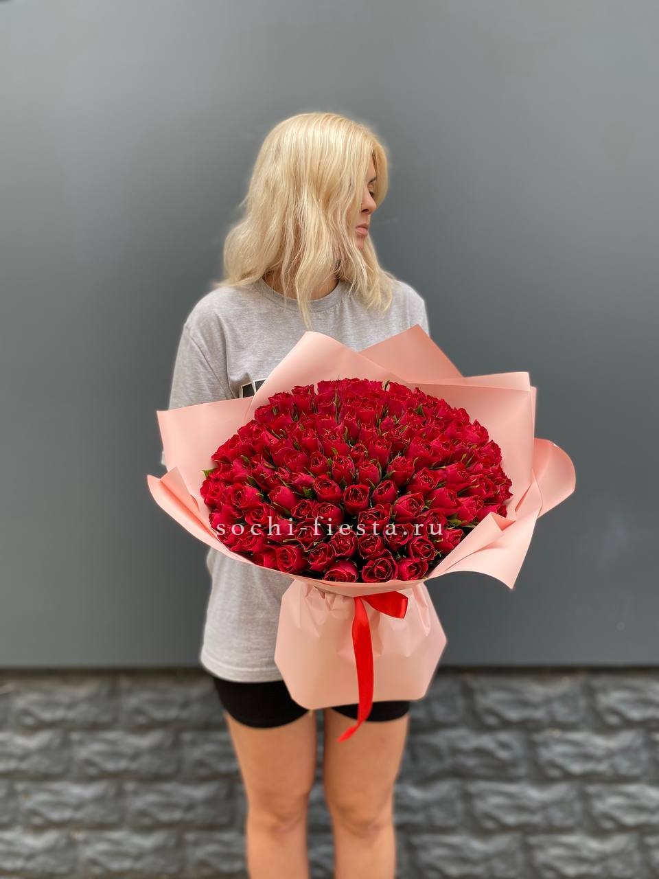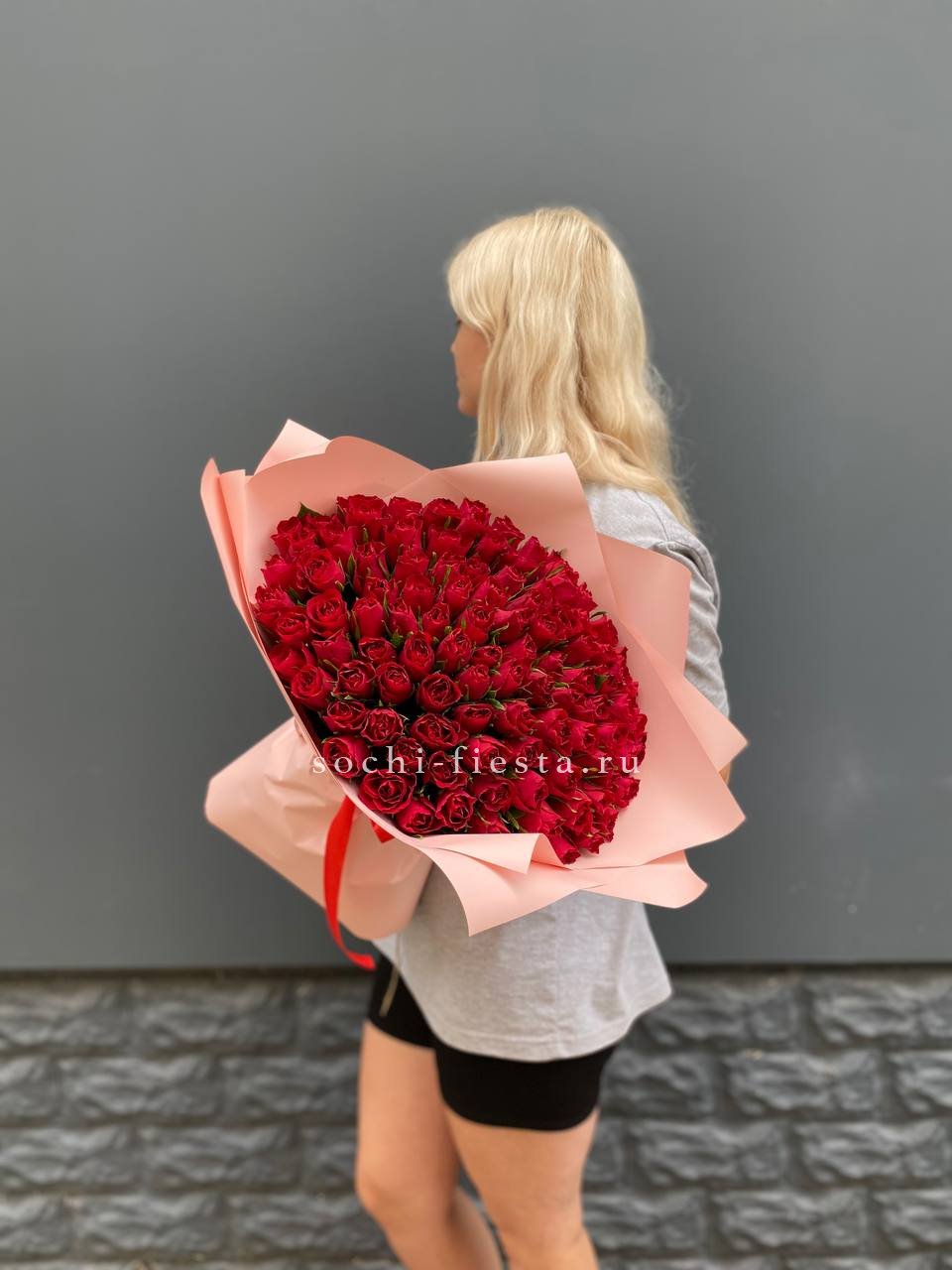 Полсотни алых бутонов образуют объемную композицию с выразительным присутствием. Классическая форма сохраняет четкость линий и долго радует свежестью.