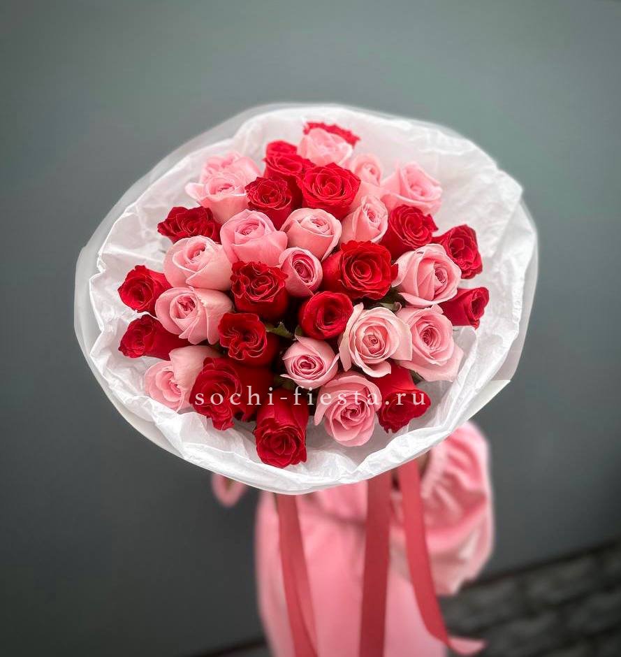 красные розы, лента, крафт.