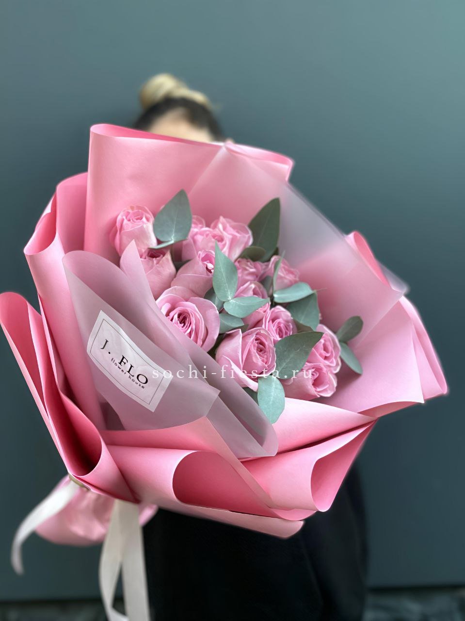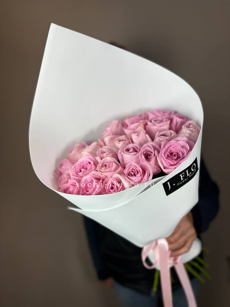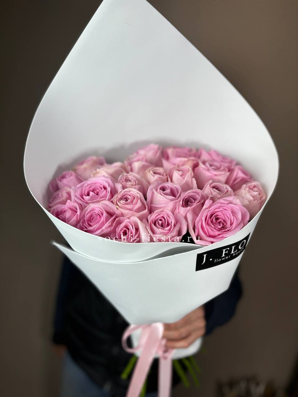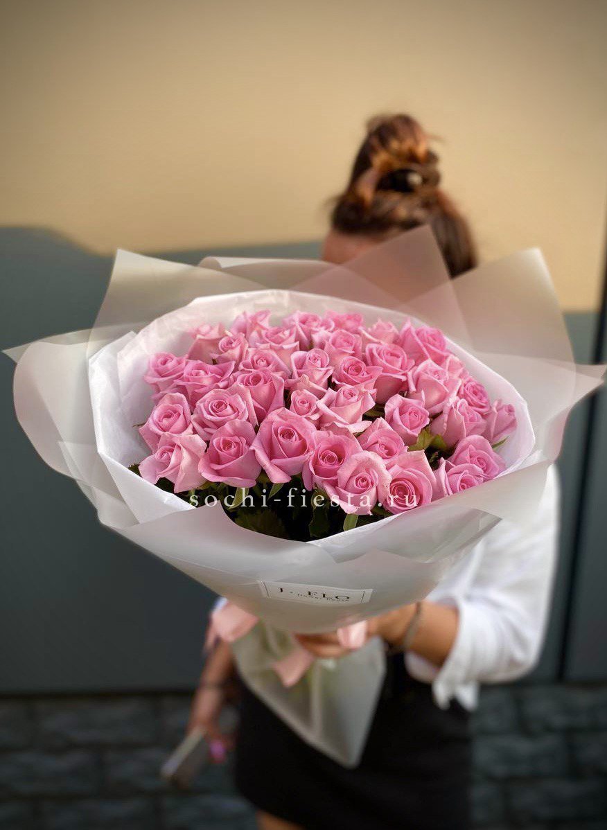 Пятьдесят одна роза собрана в плотный монохромный букет, где каждый бутон создаёт общий объём и глубину. Розовый оттенок раскрывается по-разному в зависимости от света и угла обзора. Композиция впечатляет масштабом и цельностью формы.