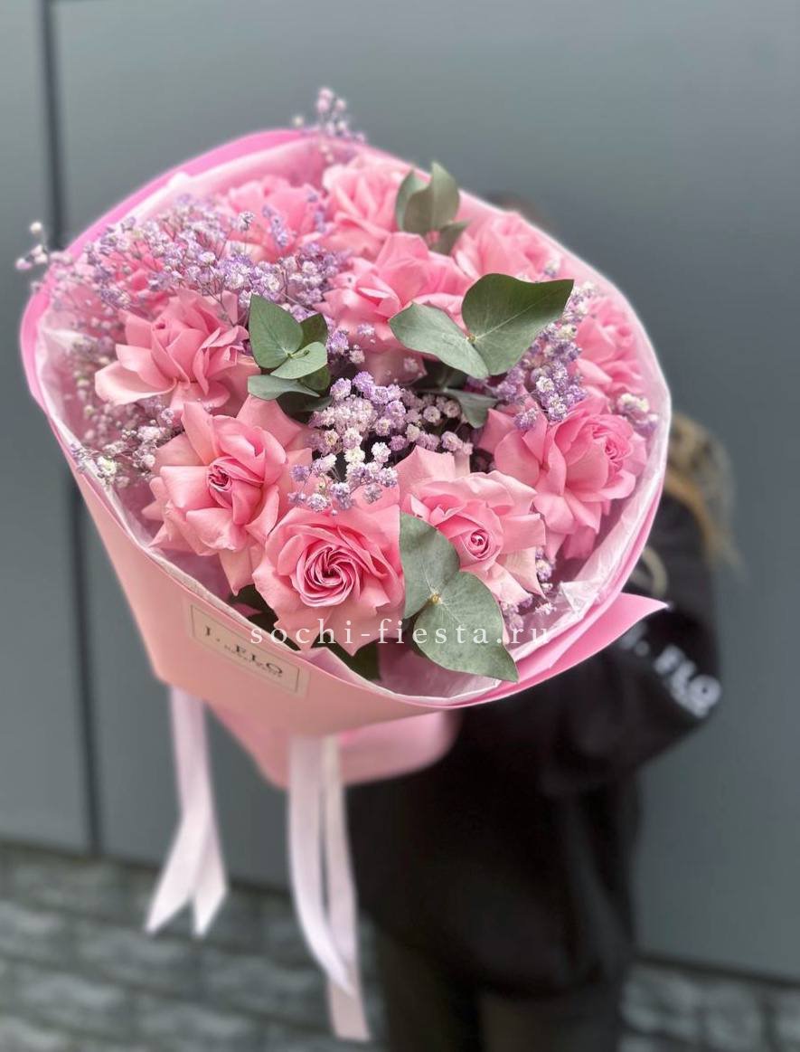 Одиннадцать вывернутых роз с волнистыми лепестками создают объёмную текстуру букета. Гипсофила добавляет воздушности, а эвкалипт завершает композицию свежими нотами.