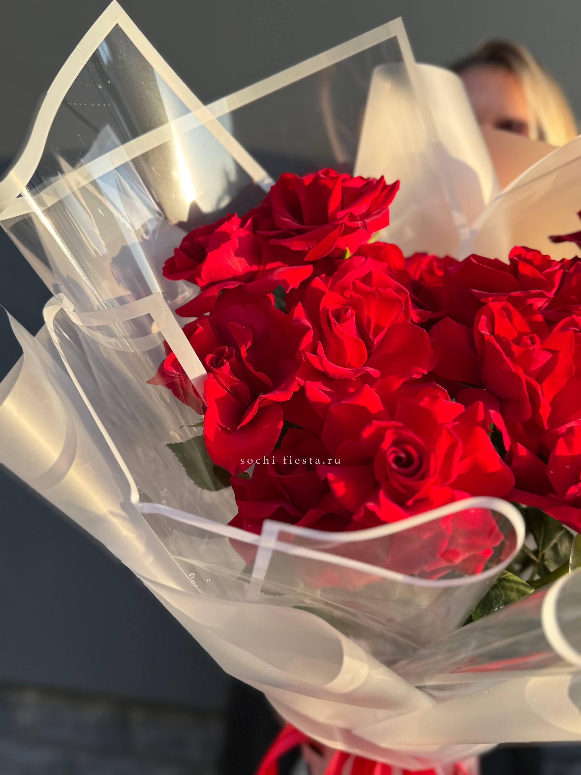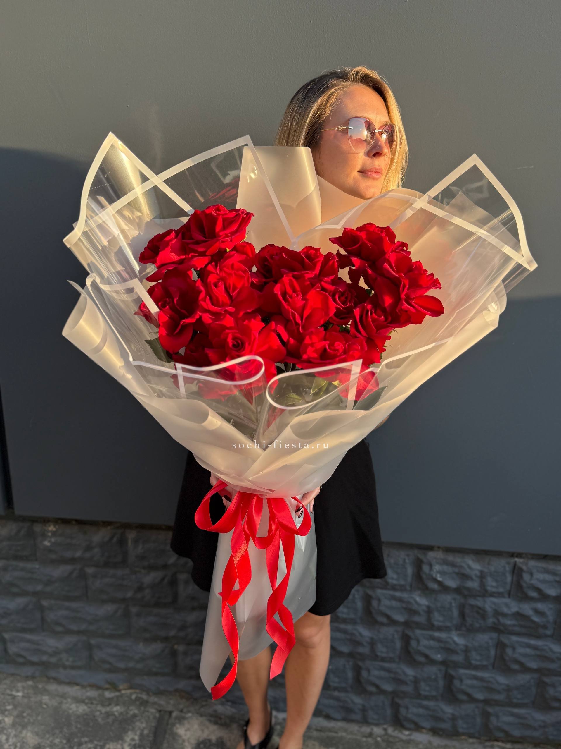 Пятнадцать красных роз на длинных стеблях выглядят графично и выразительно. Насыщенный оттенок лепестков держит внимание и создает яркий акцент.