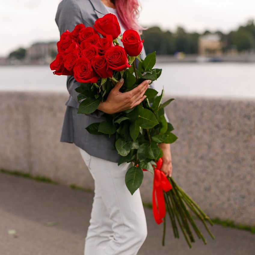 Двадцать пять бутонов выстраиваются в пышную композицию с чётким ритмом и объёмным силуэтом. Голландские розы создают впечатление монументальности и уверенной подачи.