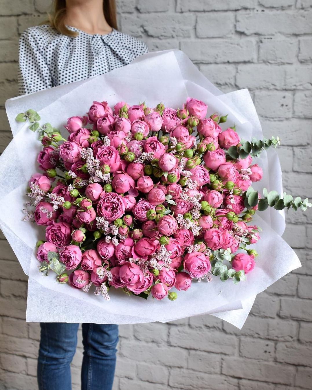 Сто одна кустовая роза Барбадос создаёт впечатляющий объём и визуальную мощь. Множество бутонов формируют плотную структуру с выразительным силуэтом. Композиция наполняет пространство и приковывает взгляд.
