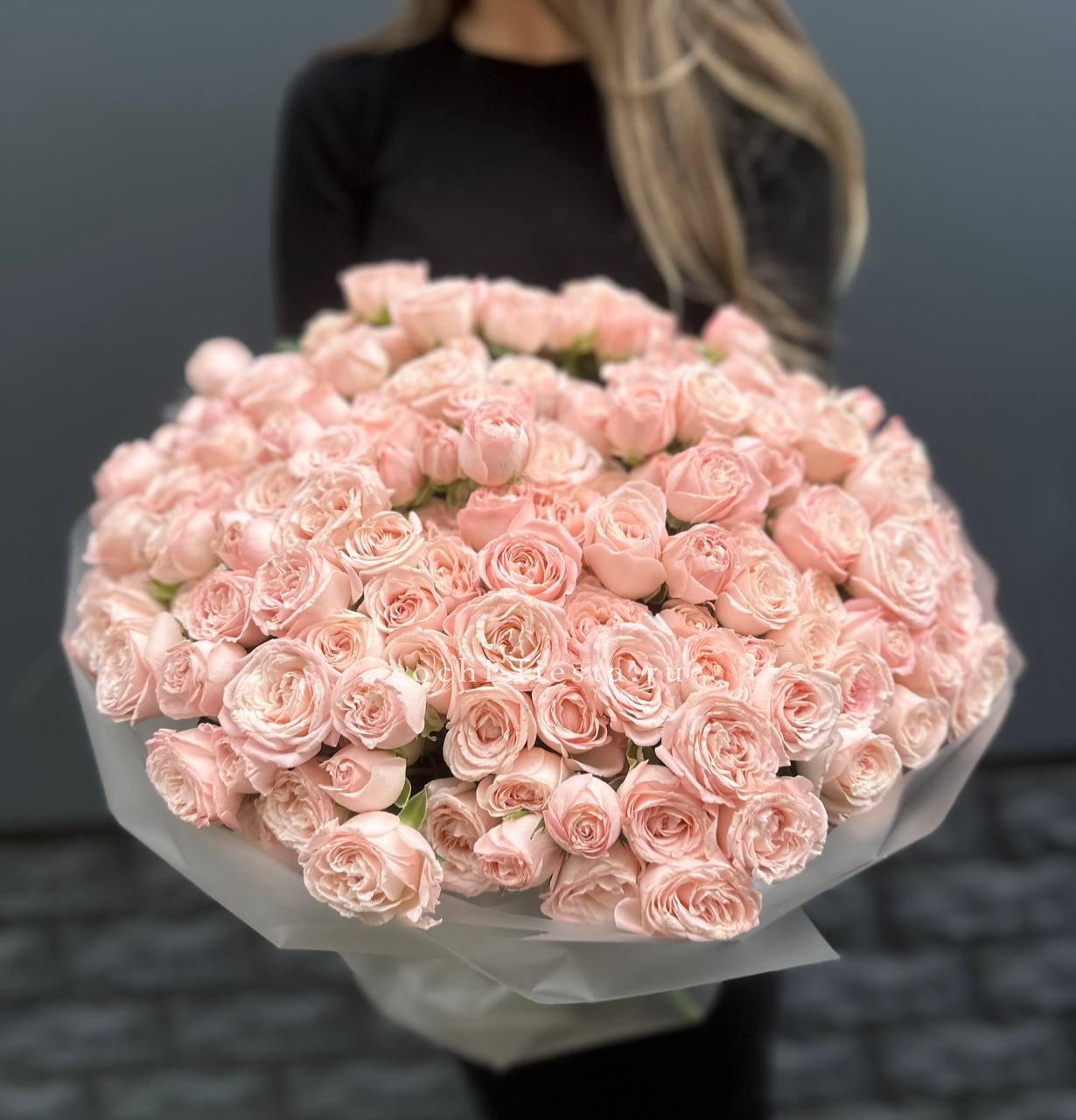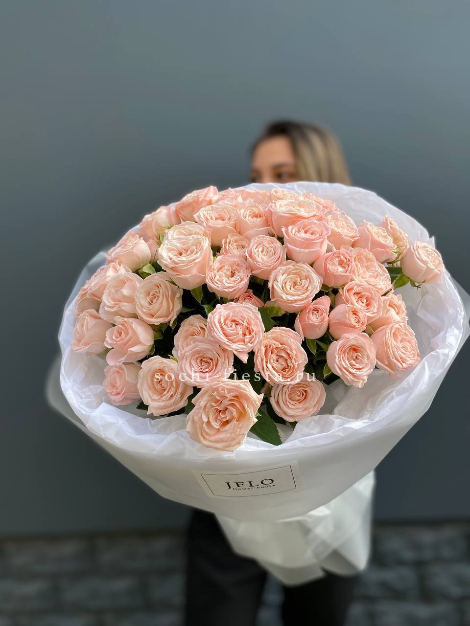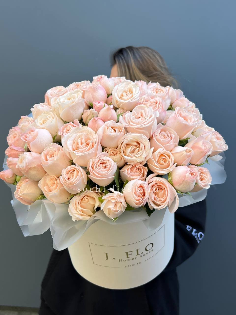 Тридцать пять пионовидных кустовых роз формируют объёмную композицию с густой текстурой. Плотно уложенные бутоны создают впечатление цветочного облака в дизайнерской упаковке.
