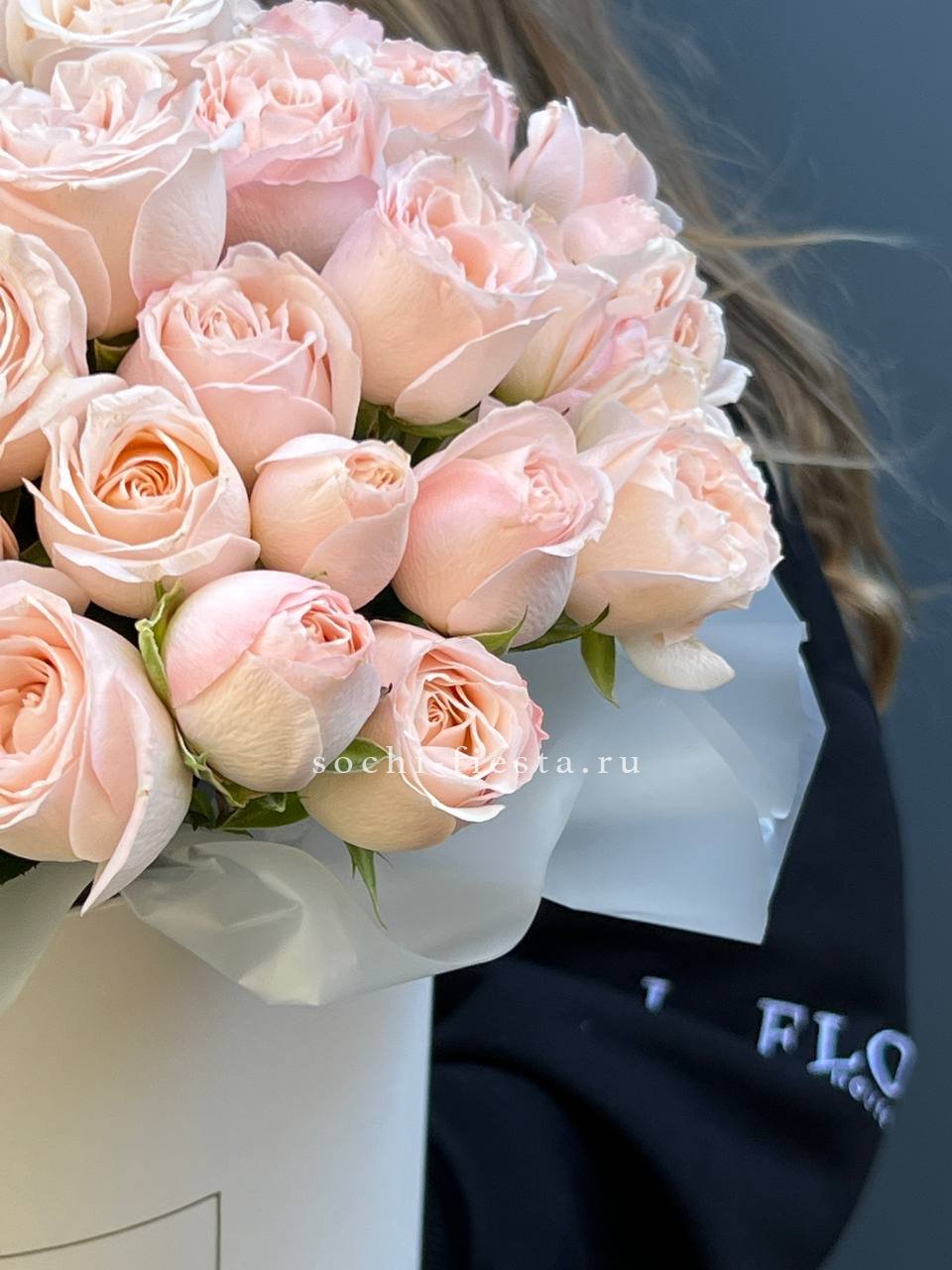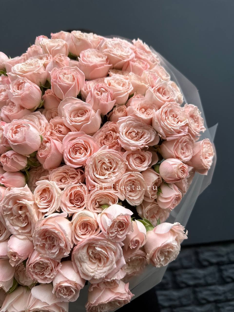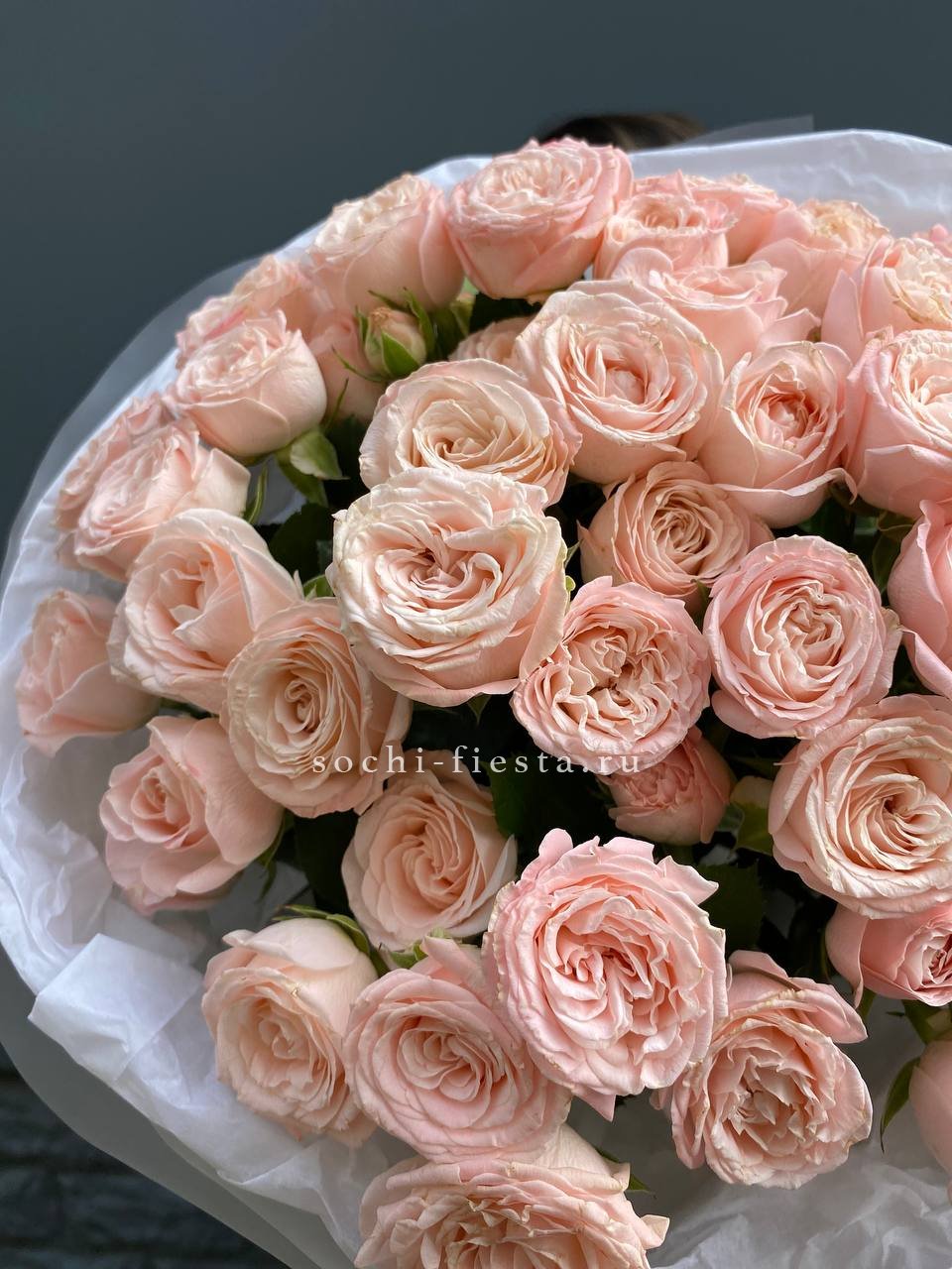 Тридцать пять пионовидных кустовых роз формируют объёмную композицию с густой текстурой. Плотно уложенные бутоны создают впечатление цветочного облака в дизайнерской упаковке.